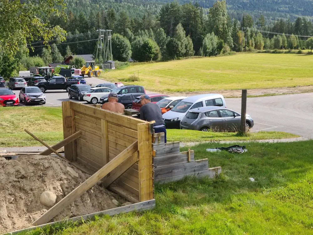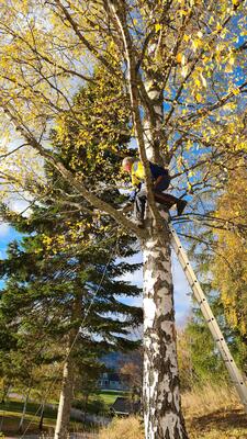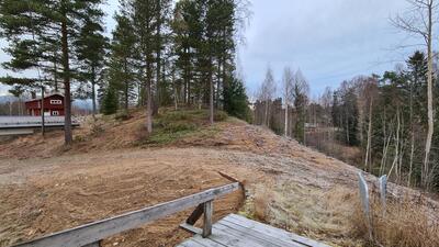 Vi har fjernet mange store trær. Noen stod så nært bygningene at det hadde blitt stor mosevekst på takene. På og rundt hele eiendommen er det hugget og ryddet, så haugens silhuett igjen kommer tydelig fram.