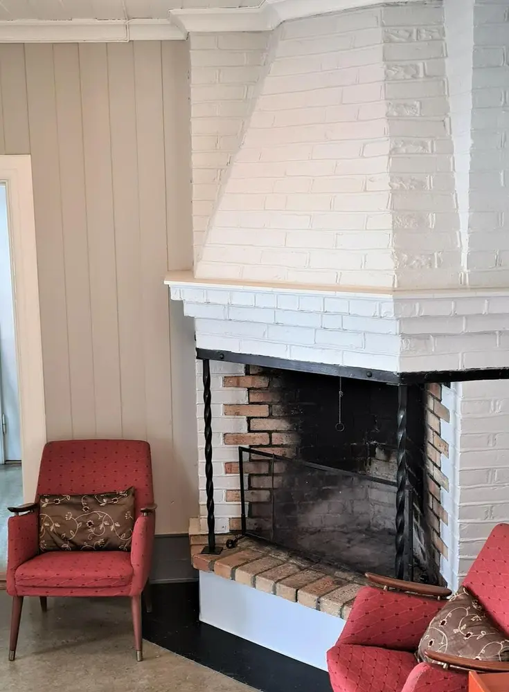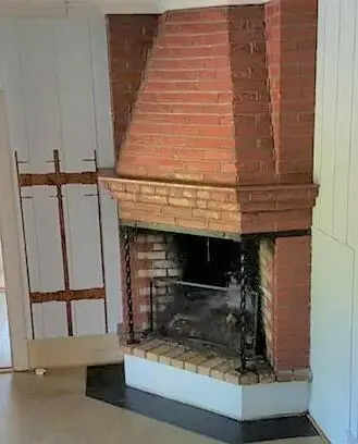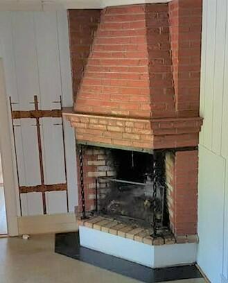 Peisen i hallen var i rød murstein. Vi ønsket å integrere den bedre med husets farger og valgte å gi den en lys grå farge. Her ser dere resultatet.