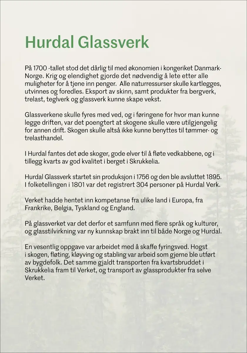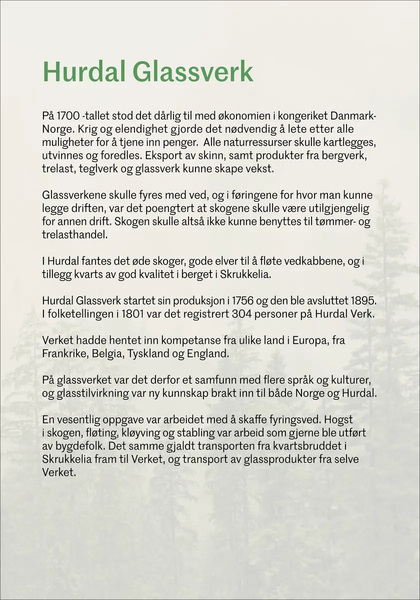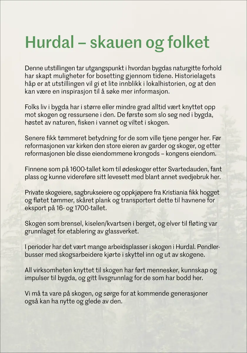 Hurdals historie er mangfoldig og tett knyttet til skogen. Utstillingen forteller om arkeologiske funn, skogfinner, Hurdal glassverk og matauk