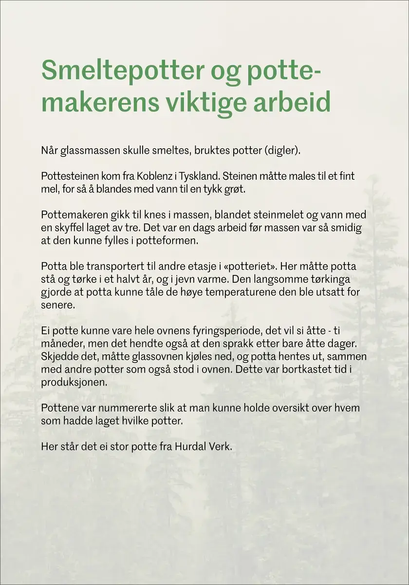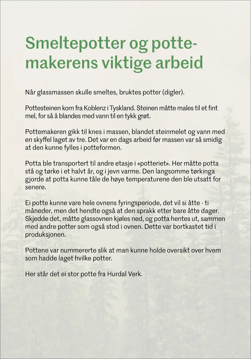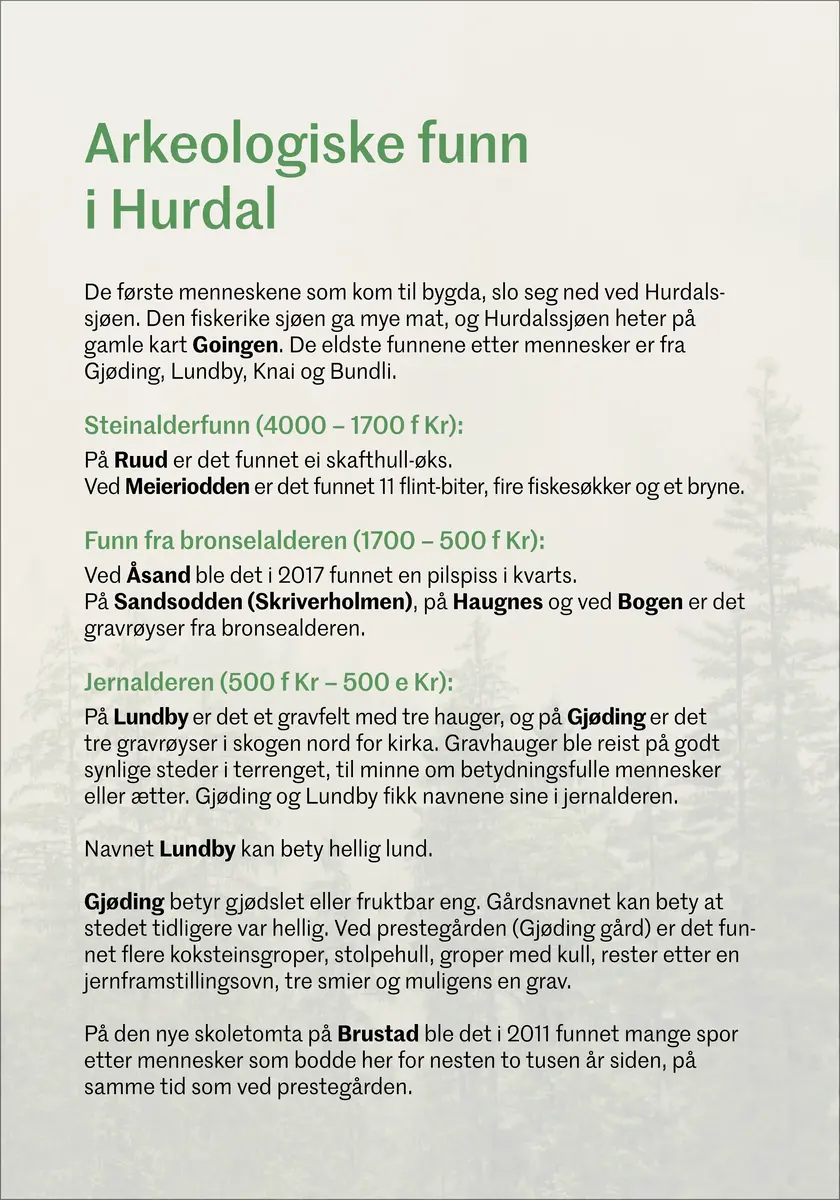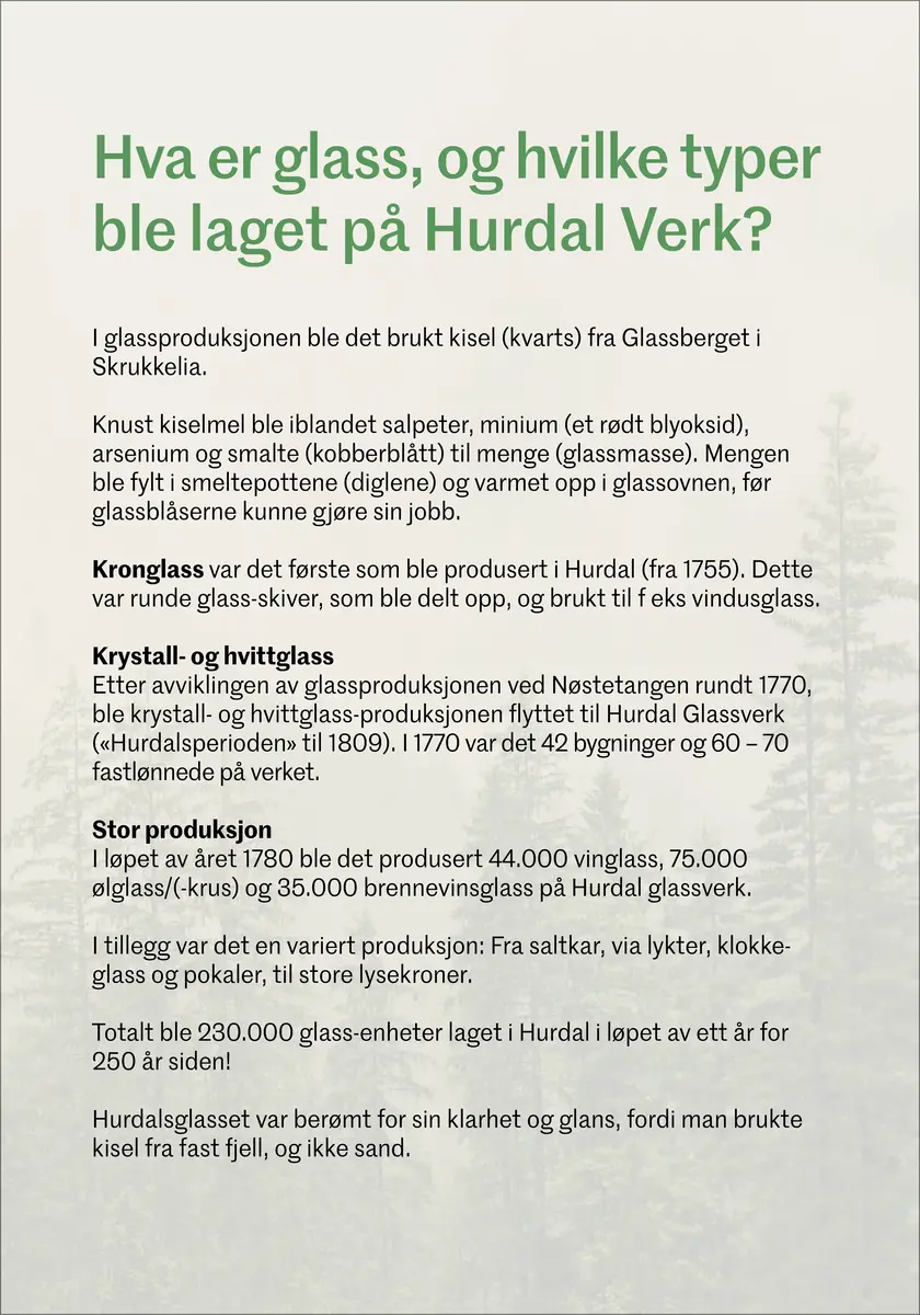 Hurdals historie er mangfoldig og tett knyttet til skogen. Utstillingen forteller om arkeologiske funn, skogfinner, Hurdal glassverk og matauk
