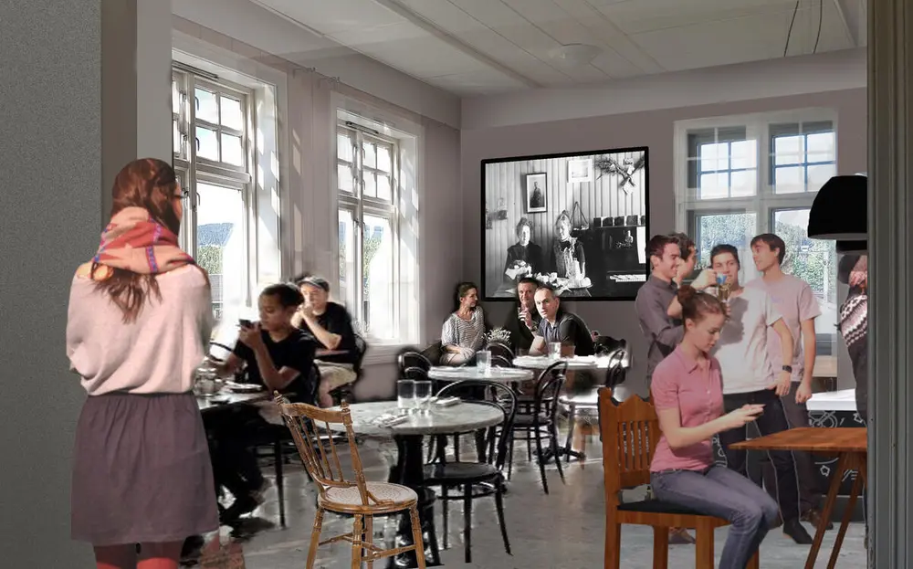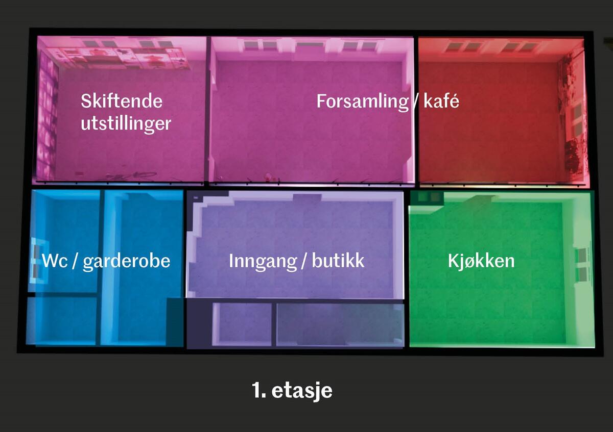 Første etasje er tilgjengelig for bevegelseshemmede. Her er det garderober, toaletter og nytt kjøkken. Ved siden av kjøkkenet finner man et større rom som vil egne seggodt til kafédrift. Vi forestiller oss å gjenbruke møbler med tanke på bærekraft og retrostemning i kaféen. Her kan man få til kurs og arrangementer som handler om tradisjonsmat og bærekraft.