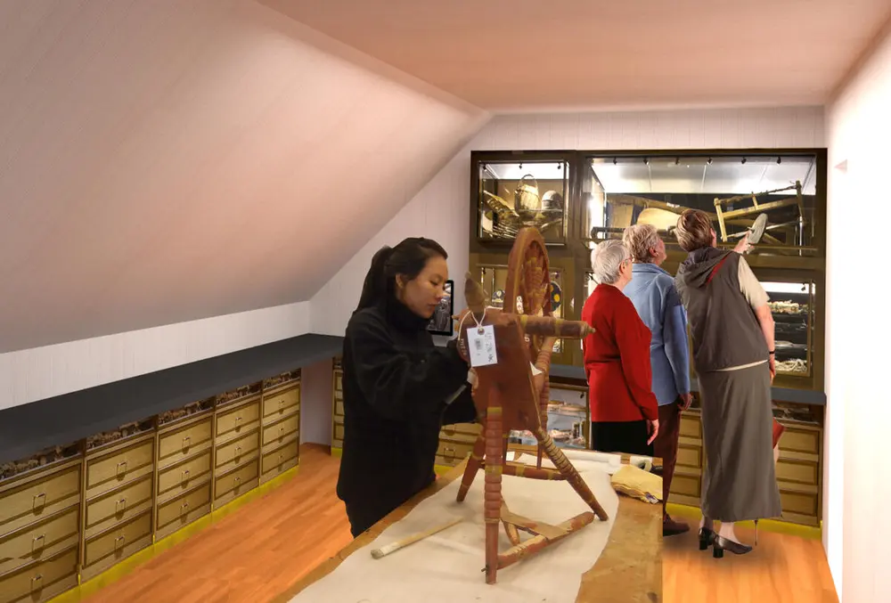 Vi ser på samlingen som en skatt som publikum, skolebarn og historielagets medlemmer kan gå på skattejakt i. Derfor vil vi flytte alle gjenstandene inn på åpne hyller i de fire mellomstore rommene i 2. etasje. Her kan historielagets omvisere ta med grupper på 1-5 besøkende som kan gå på oppdagelsesferd i magasinenes gjenstandssamlinger. Sammen med omviserne kan de besøkende ta ut samlinger av gjenstander, som kan undersøkes nærmere ved aktivitetsbord i 1. etasje.