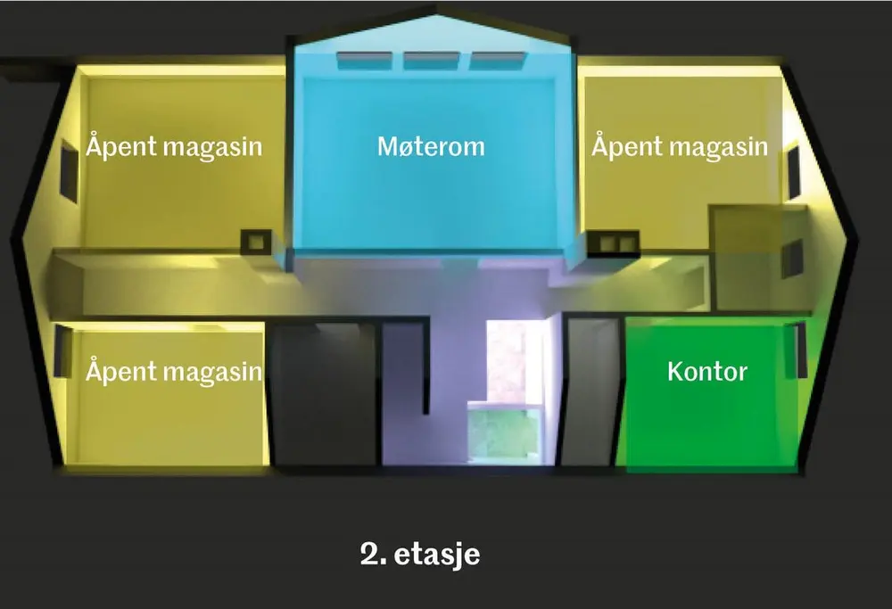 I 2. etasje er det et stort rom og fire mellomstore rom. Det største rommet vil egne seg godt til kontor og til å romme Hurdal Historielags boksamling. Det kan innredes med store bord som gir mulighet for møter, fordypning i historiske arkivalier og arbeid med gjenstander fra historielagets samling. Slektshistorisk utvalg har også behov for kontorplass. De fire mellomstore rommene kan brukes til et nytt museumskonsept i Norge – åpne magasinsamlinger.
