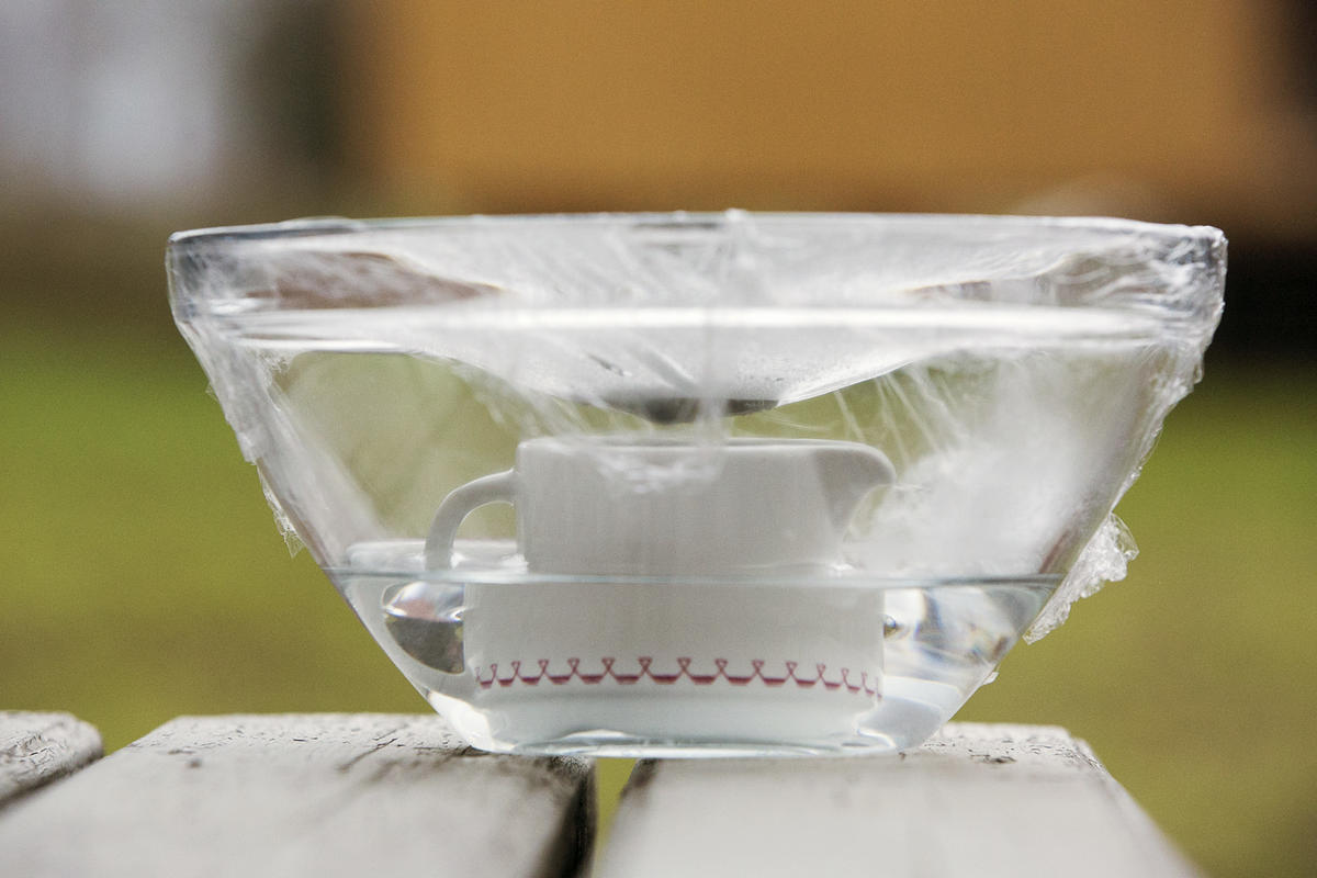 Til dette eksperimentet trenger du en skål og en kopp eller glass som er lavere enn kanten på skålen. Du trenger plastfolie og muligens en strikk til å holde plasten på plass.