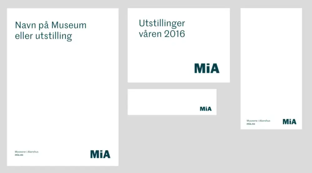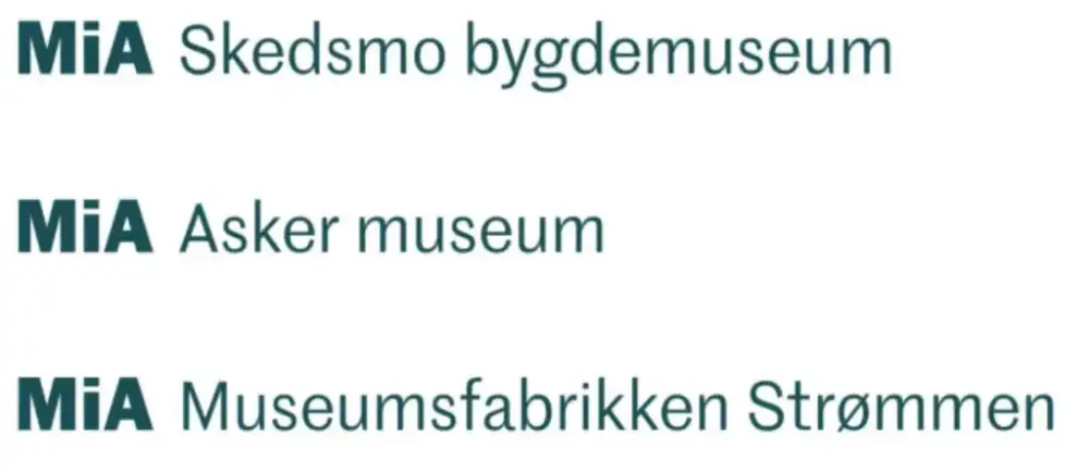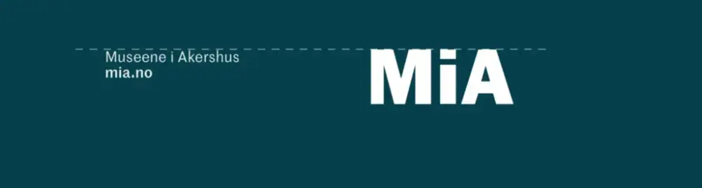 Teksten som står sammen med logoen « Museene i Akershus / mia.no» plasseres nede i venstre hjørne. Logo og tekst skal ligge på samme topplinje som vist i illustrasjon.