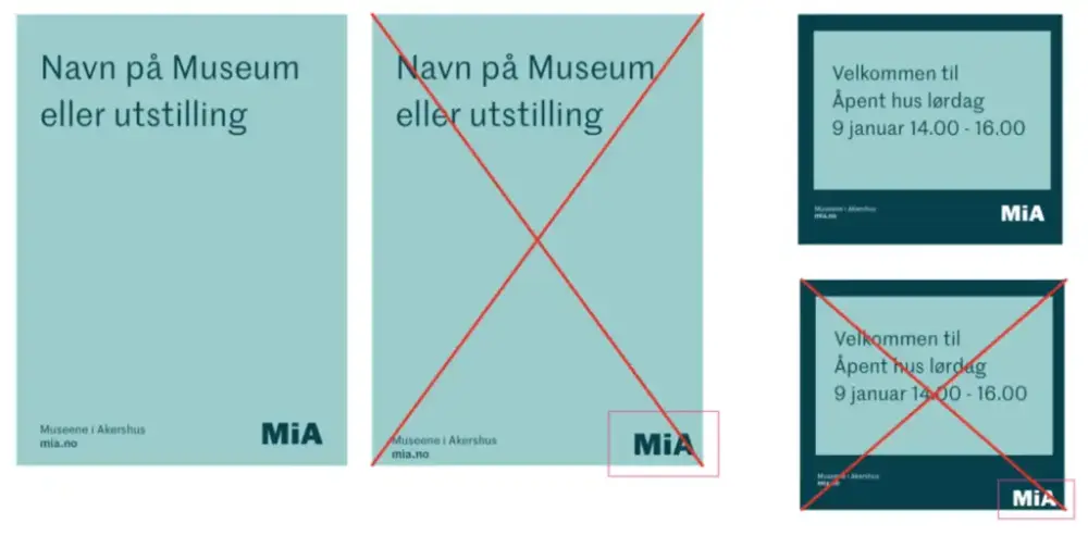 - Eksempel B: Her er Logo plassert for nær formatet i ytterkanten slik at margen blir for liten, avsenderteksten ligger heller ikke på linje med MiA-logoen.