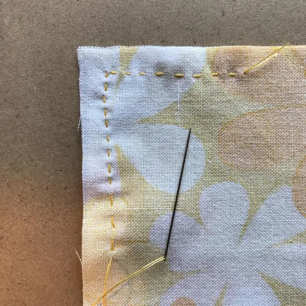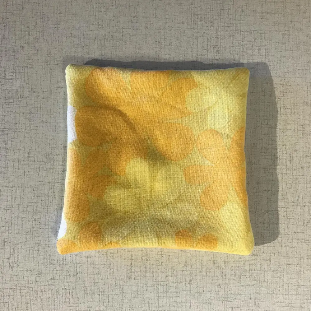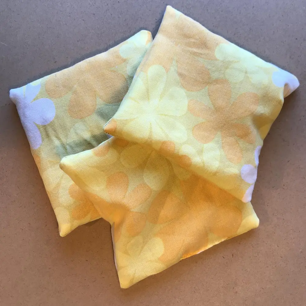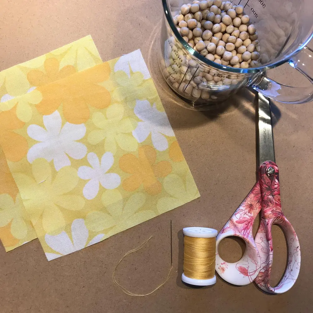Klipp ut to firkanter som måler 15 cm x 15 cm. Legg stoffsidene med rettsiden mot hverandre og sy en som rundt, enten for hånd eller med symaskin. La det være igjen en liten åpning slik at du får vrengt posen.