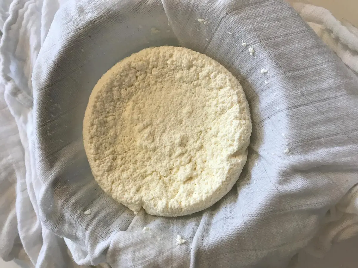 Mysen siles fra ostemassen gjennom en gasklut. - 3/3