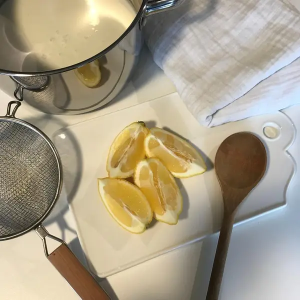 Hell surmelken over i en kjele og tilsett saften av én sitron. Varm melken forsiktig opp på komfyren til ca 50-60 grader. La den stå slik til ostemassen skiller seg fra mysen, det tar ca 15-20 minutter.