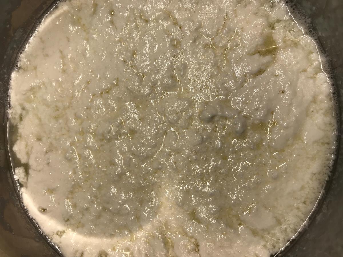 Når ostemassen har skilt seg tar du kjelen av plata.