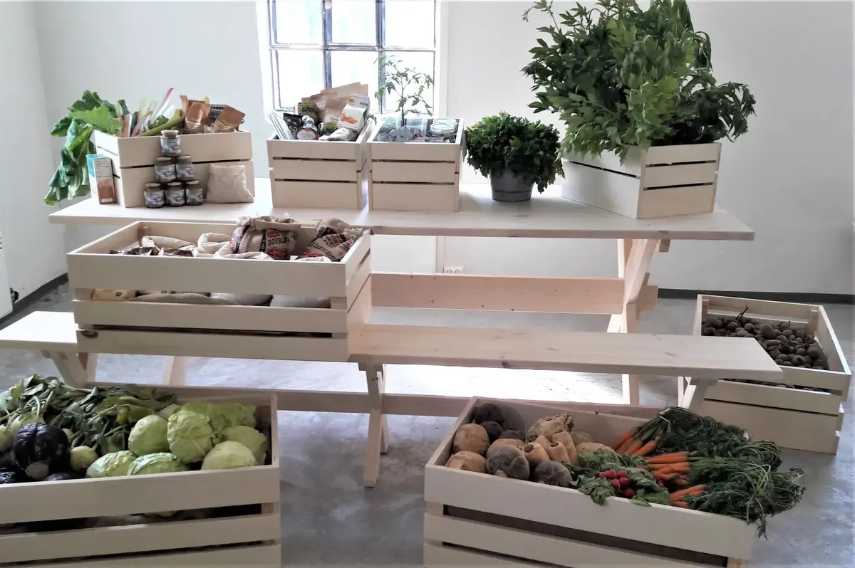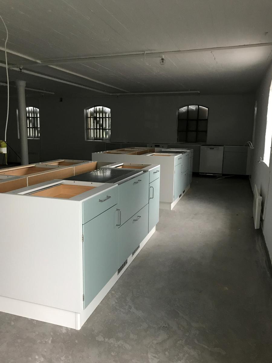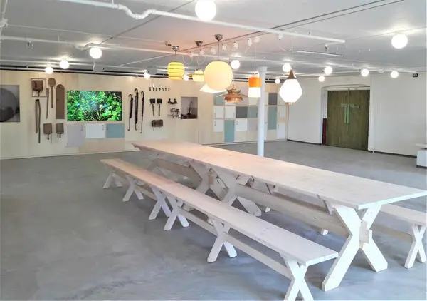 Tre langbord med benker gir sitteplasser til 36 personer. En TV-skjerm i enden av langbordene gir muligheten for å supplere formidlingen med foto og videoer. På kjøkkenet er det undervisningsplass til 10 personer. Her inviterer vi til kurs og verksteder der publikum kan lære om blant annet matlagingsteknikker som fermentering, takkebakst og hermetisering. En moderne vedfyrt komfyr venter nå på pipeløp før den kan fyres opp og brukes til brødbaking og vaffelsteking.