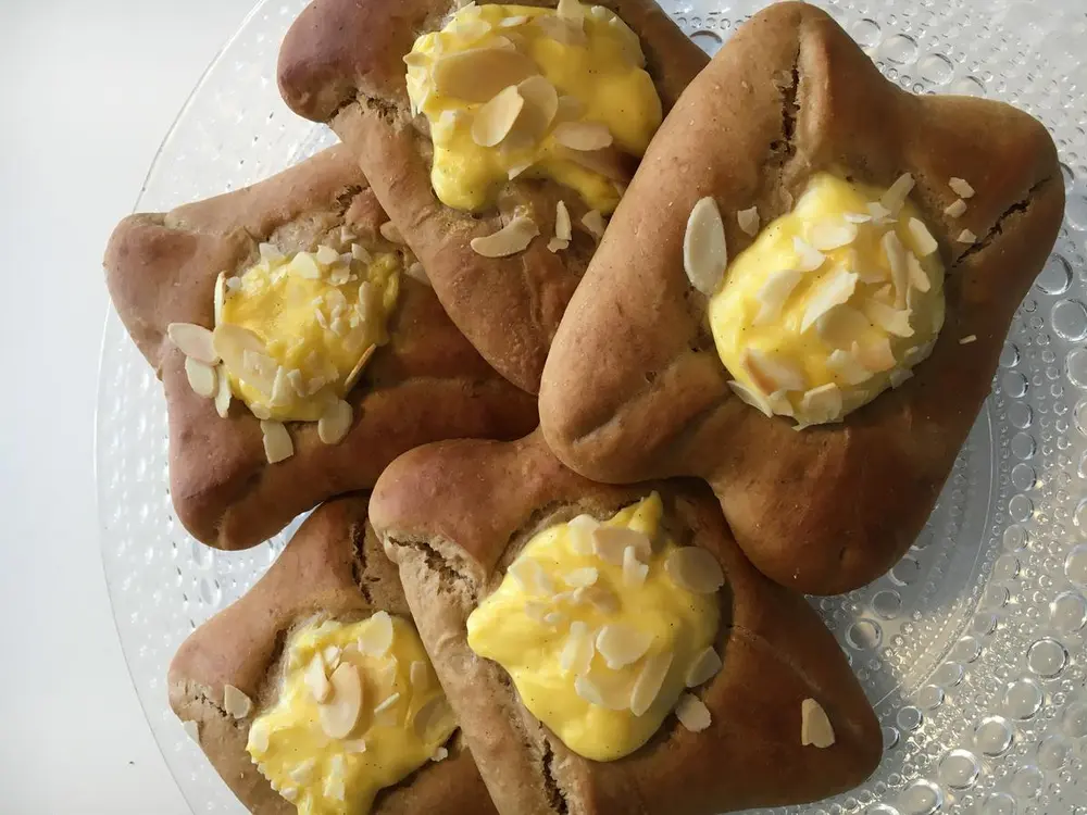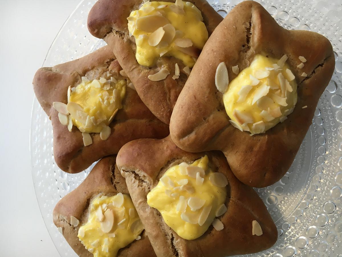 Del opp deigen i 24 emner og trill ut til boller. Kjevle bollene flate og fyll med en ss mandelmass. Brett inn fra fire hjørner slik at bollene er "lukket". Legg på en god spiseskje med ferdig vaniljekrem og dryss over litt mandelflak. La bollene etterheve ca 30 minutter.