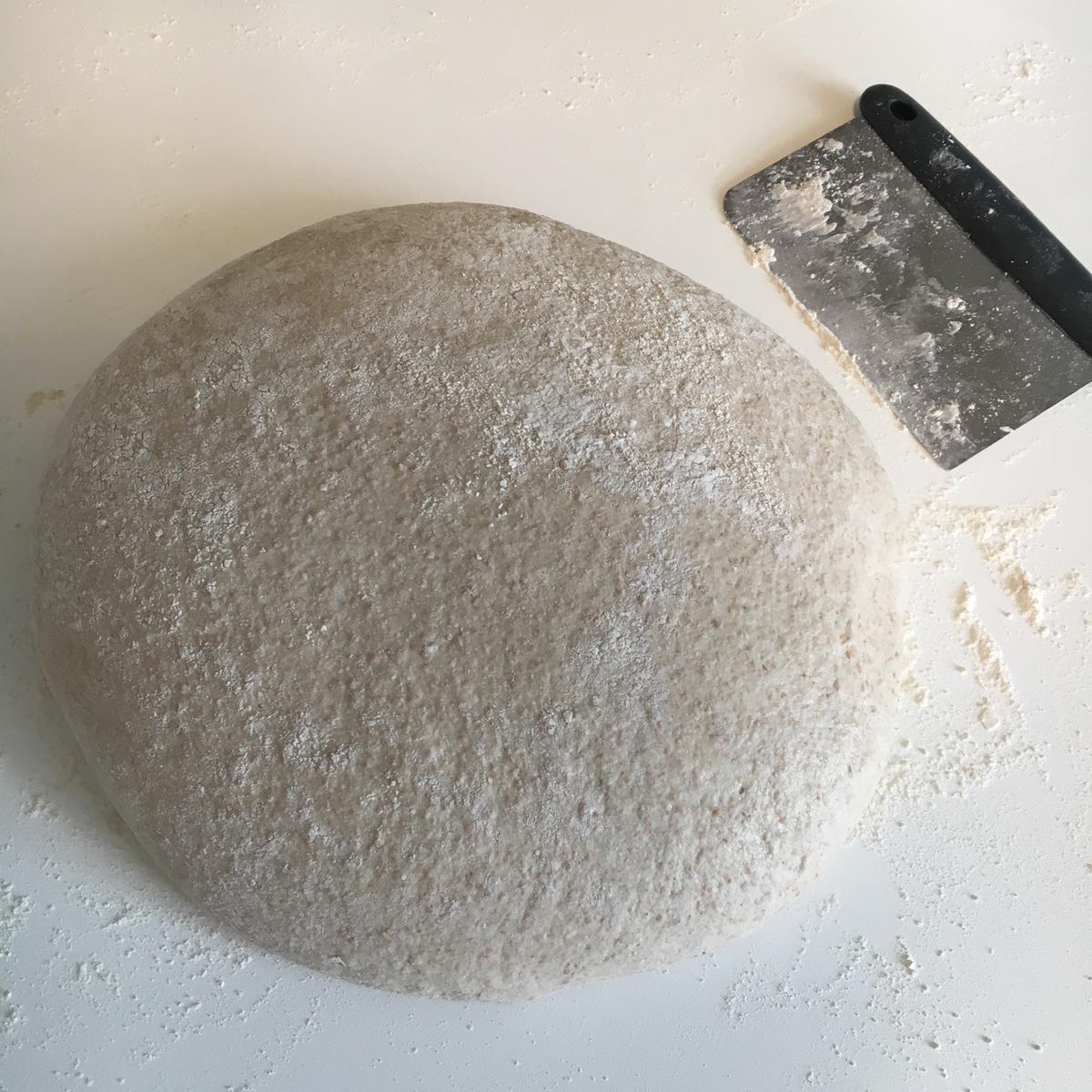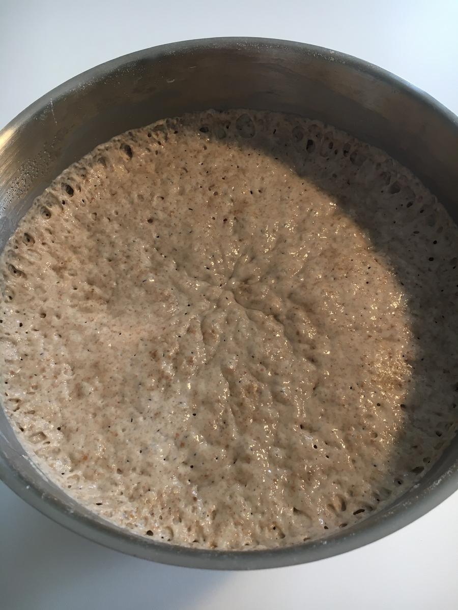 Elt alle ingrediensene sammen i en bakebolle og la heve over natten, ca 16 timer.
