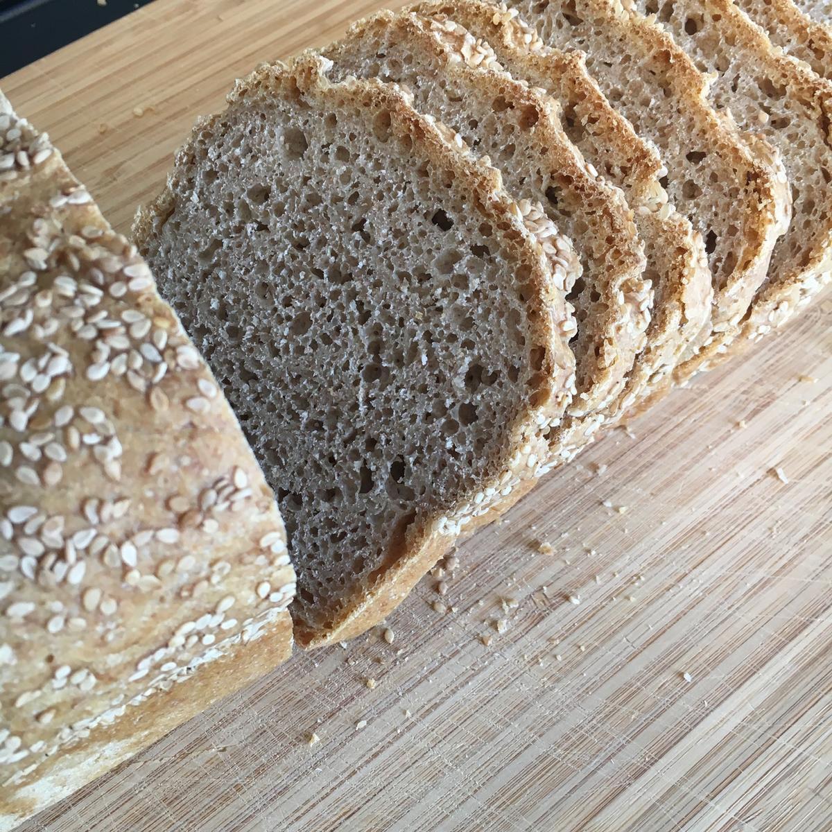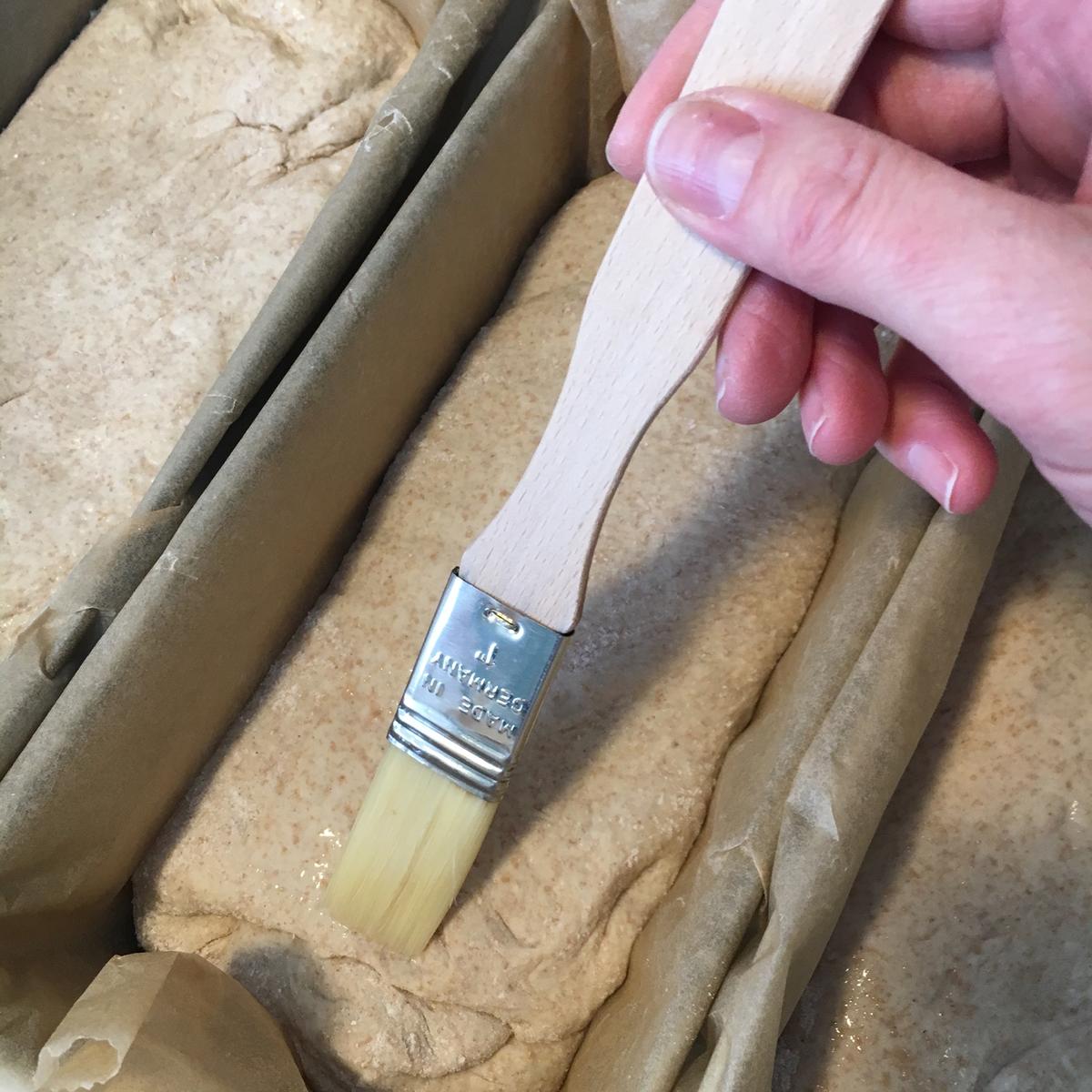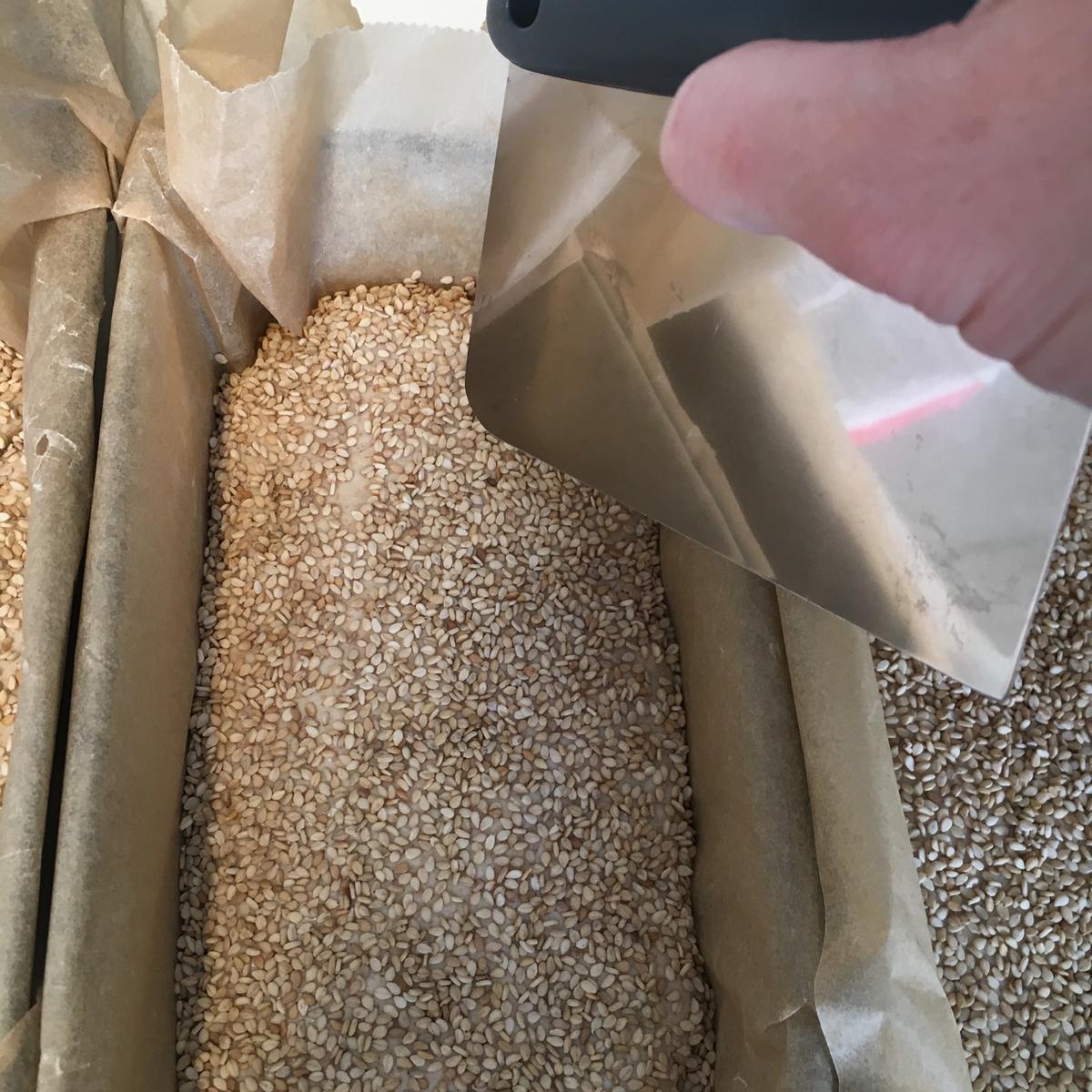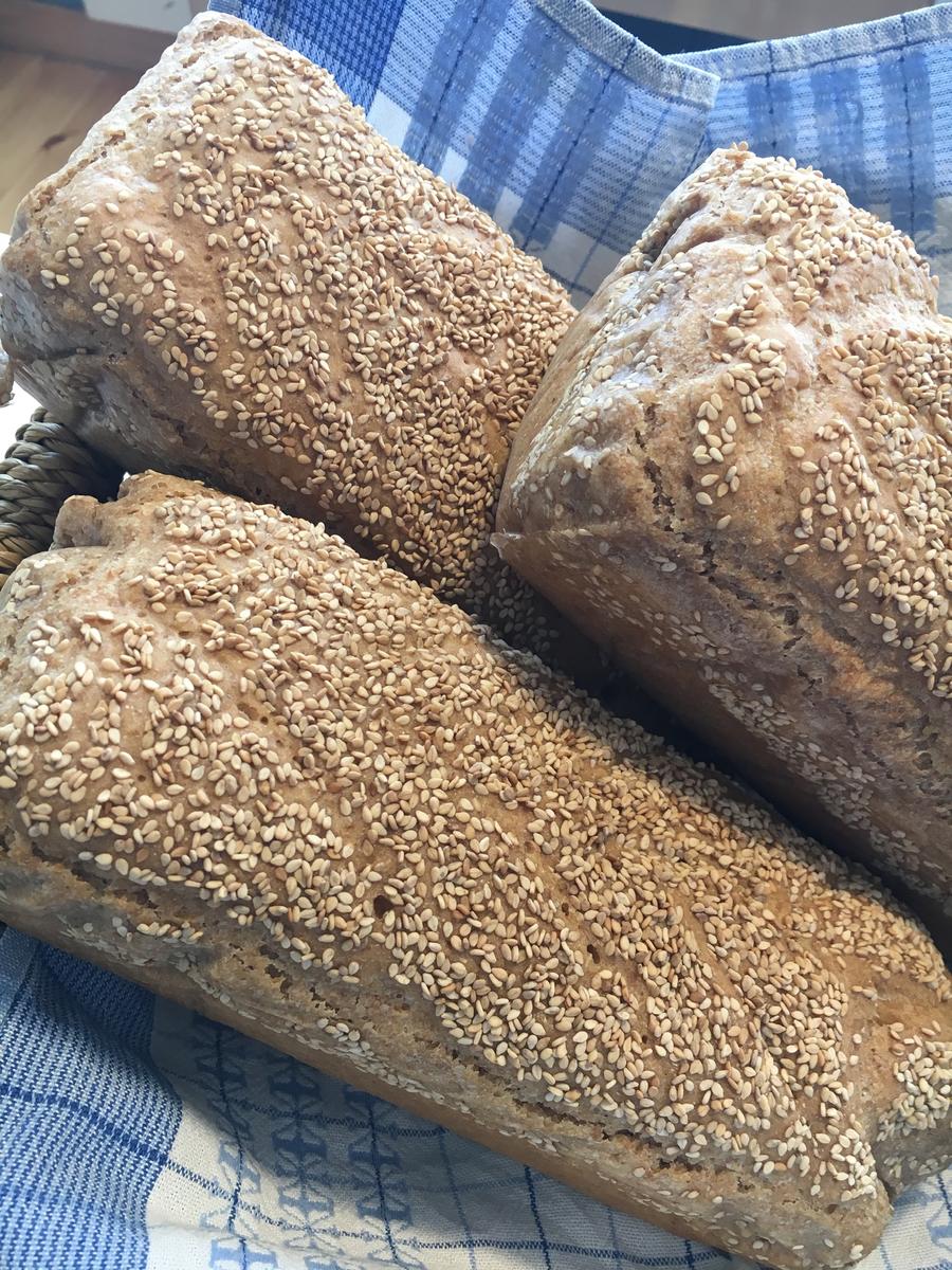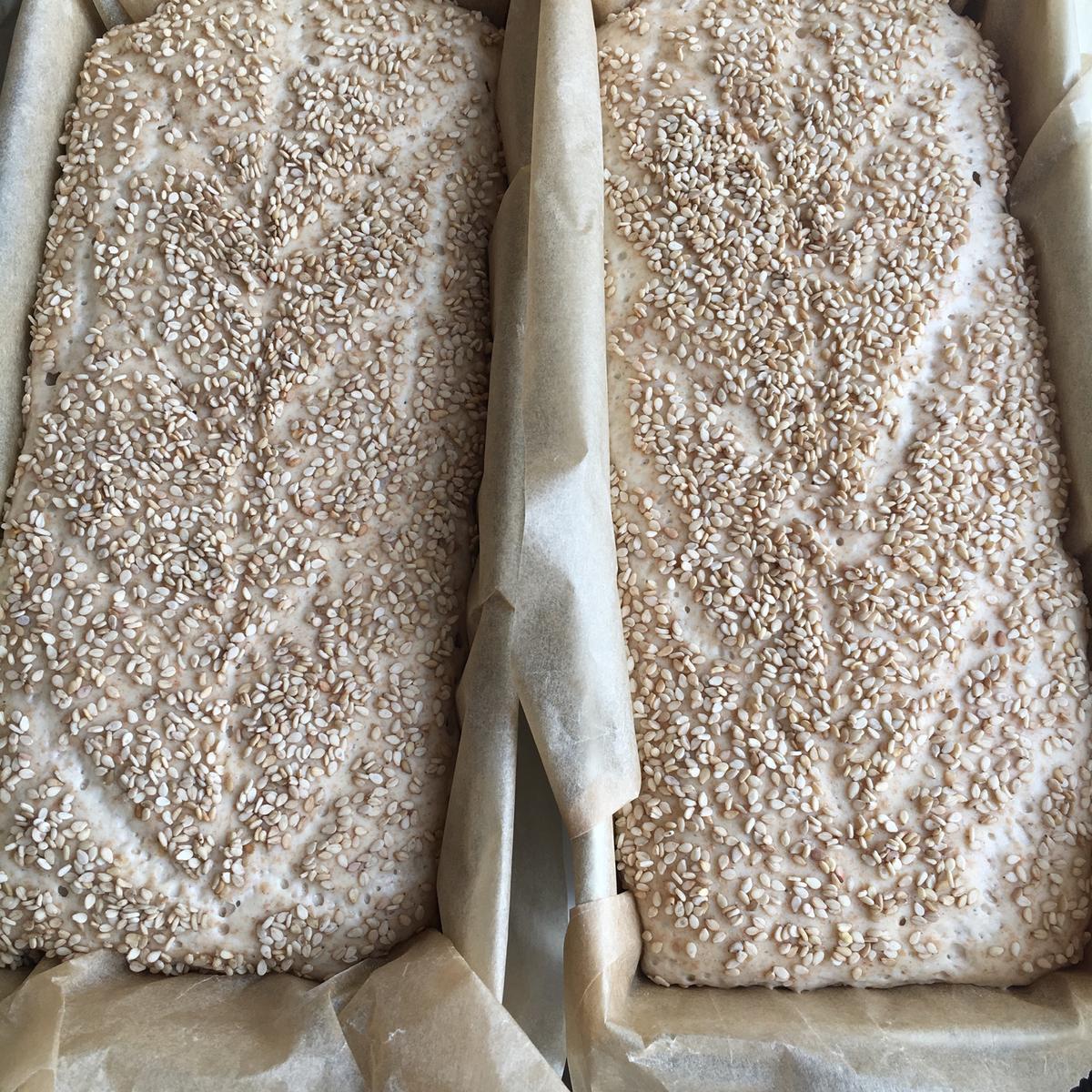 Ha deigen over på et melet bakebord og elt den godt sammen. Del i tre emner som formes til brød. Ha brødene over i smurte eller bakepapirkledte former. Pensle med vann og strø over godt med sesamfrø, det gir en god nøtteaktig smak på skorpa. Skjær noen snitt i brødene med en skarp kniv.
