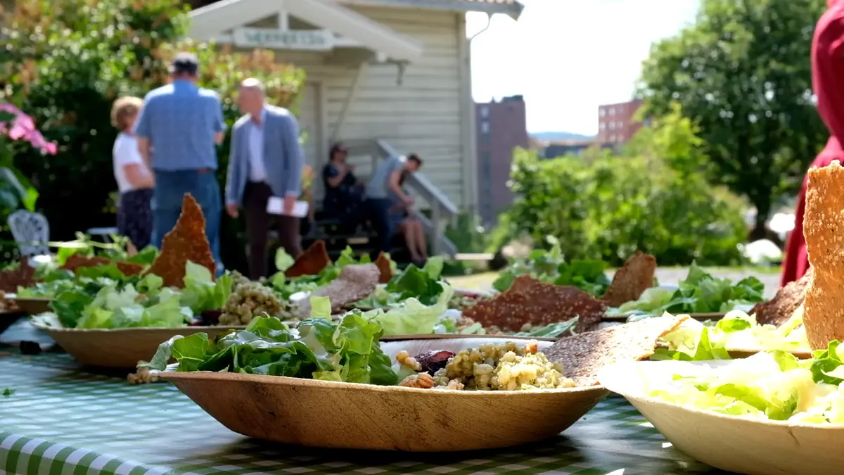 I kafeen serverer vi hjemmelaget mat laget på økologiske råvarer så langt det går. Du kan nyte maten inne i våre museumsstuer, ute i hagen eller ta den med deg videre på turen.