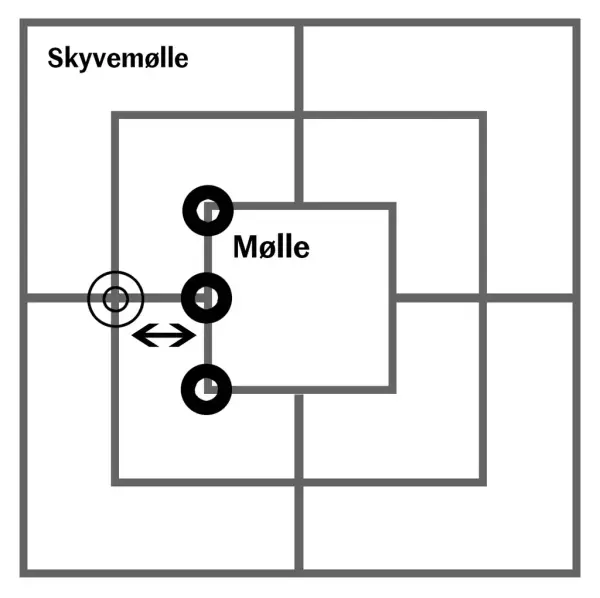 - Får en lagt tre brikker på rad, kalles det mølle, og en har rett til å ta vekk en brikke fra motstanderen. Brikker som blir tatt, går ut av spillet.