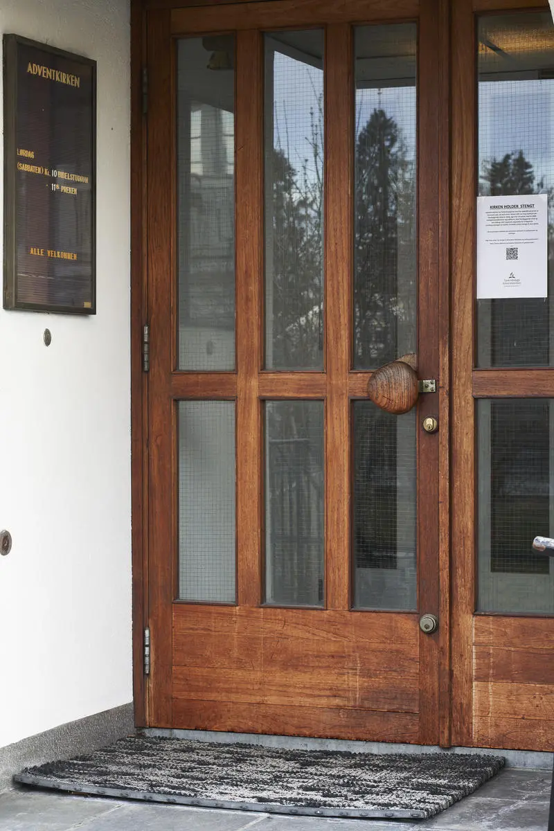 Koronaskilt på kirkedør på Advent kirken på Strømmen under koronanedstengningen - 5/7