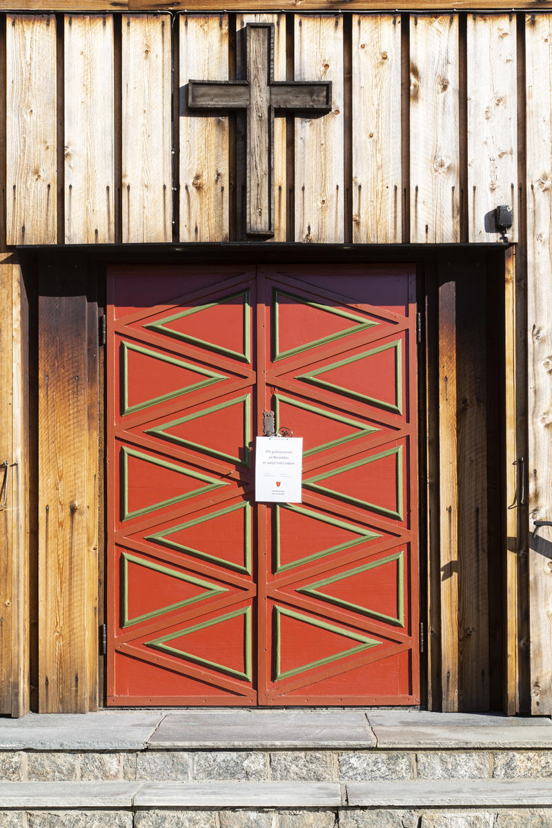 Koronaskilt på kirkedør på Østerås under koronanedstengningen - 7/7