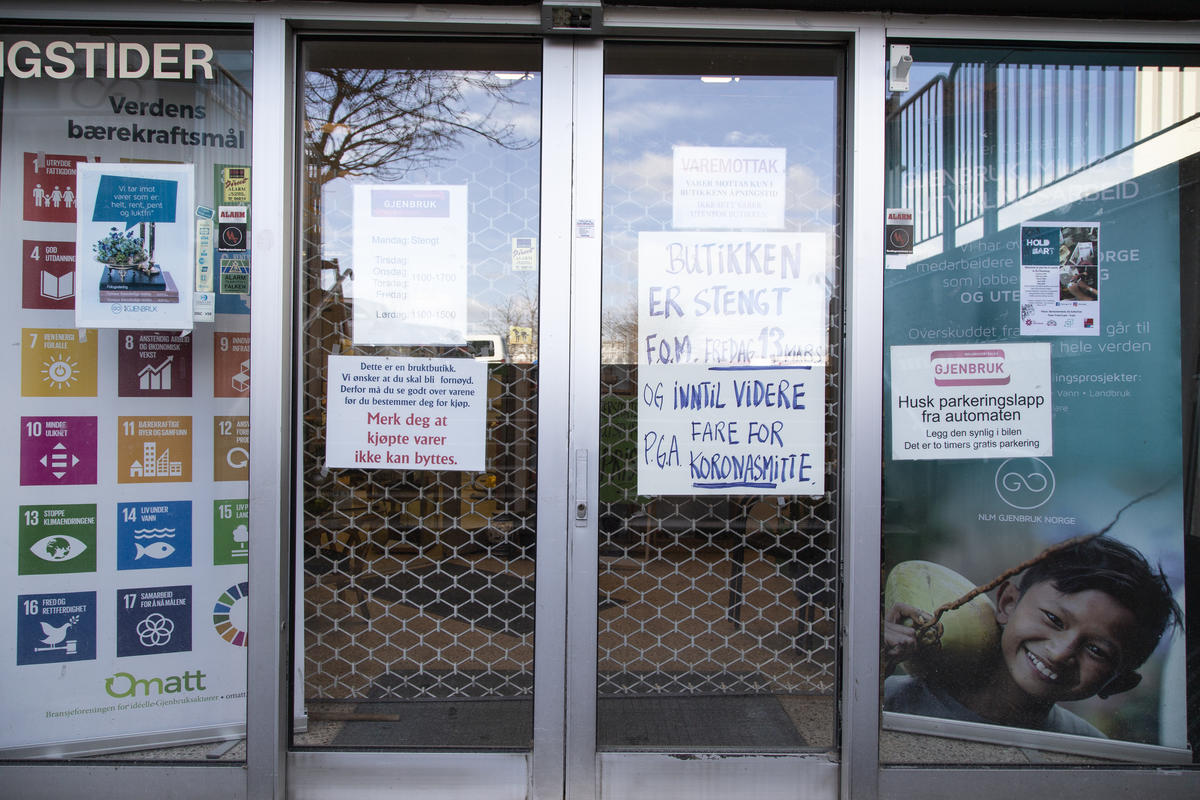 Koronaskilt på butikk på Strømmen under koronanedstengningen - 14/17