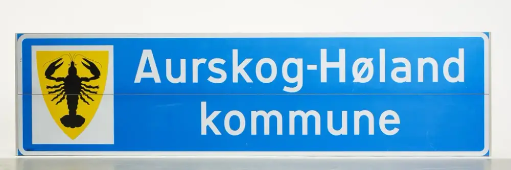Veiskiltet, kommunevåpenet, flagget og klistermerkene er samlet til MiAs samlinger i forbindelse med kommunereformen 2020. Alle foto: MIA-Museene i Akershus, 2020.
