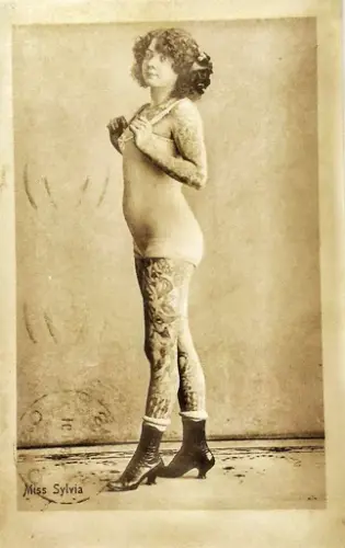 Miss Sylvia. En tatovert kvinne fra begynnelsen av 1900-tallet. Postkort. Foto: MiA