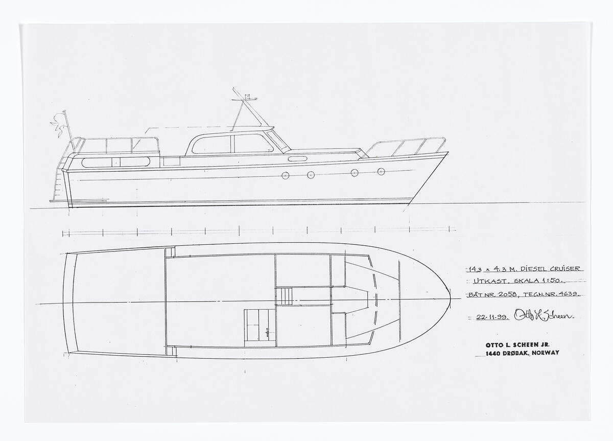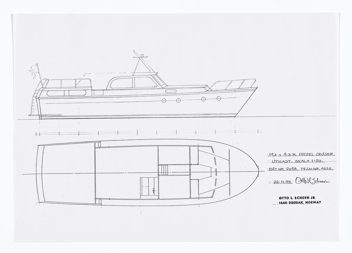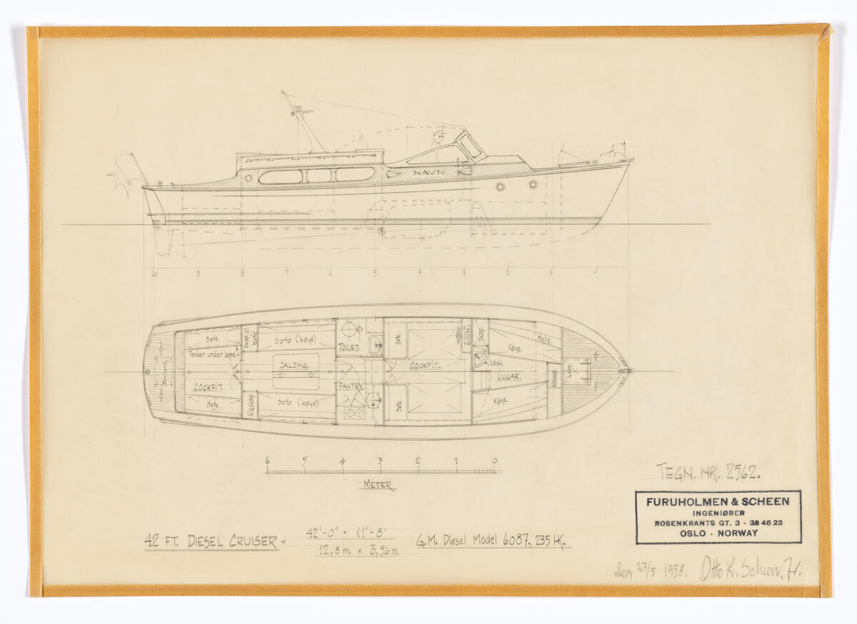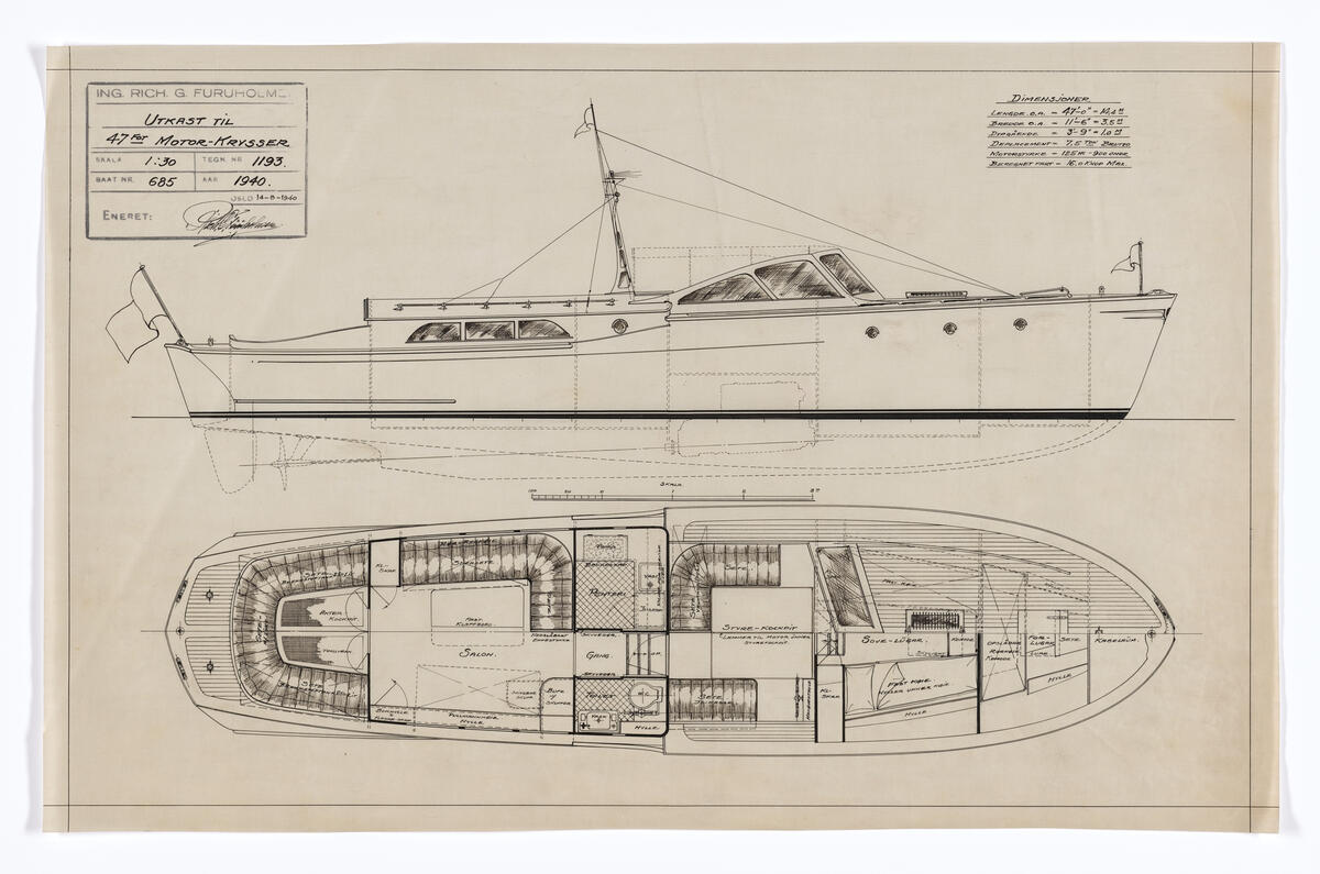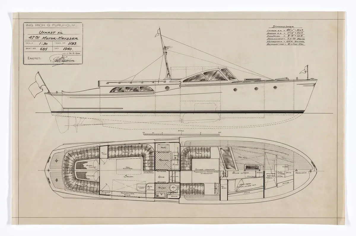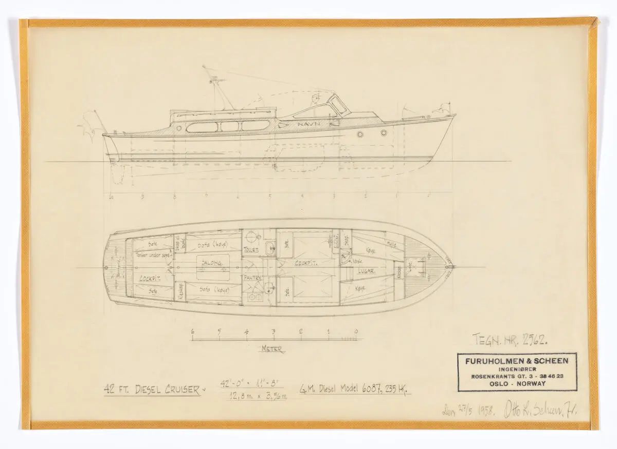 Tegning av skip fra arkivet til skipskonstruktør Otto L. Scheen