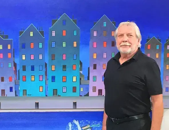 "Min kunstneriske stil er preget av surrealisme og bruk av ulike teknikker som olje- og akrylmaling, reliefftrykk og silketrykk med metalliske effekter", sier Baker.