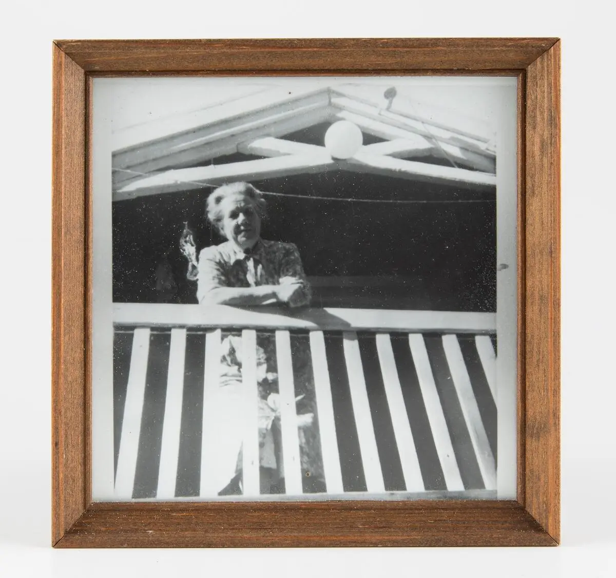 Borghild Grønvold fotorafert ute på trappa i 2. etg. på Grønvoldstua.