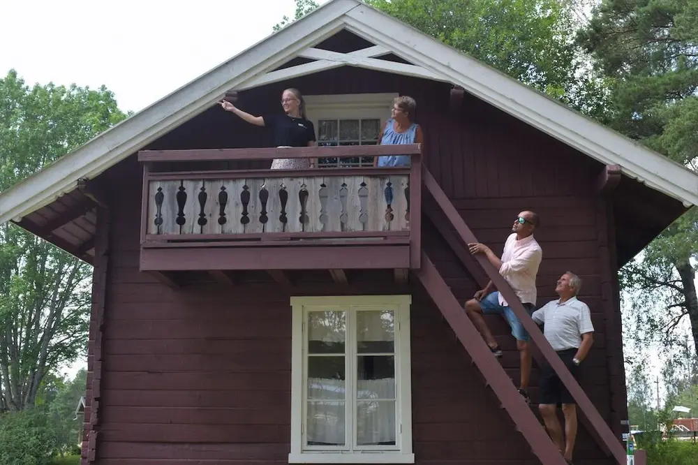 Grønvoldstua i dag. En omviser med besøkende står på den samme trappa som Borghild gjorde.