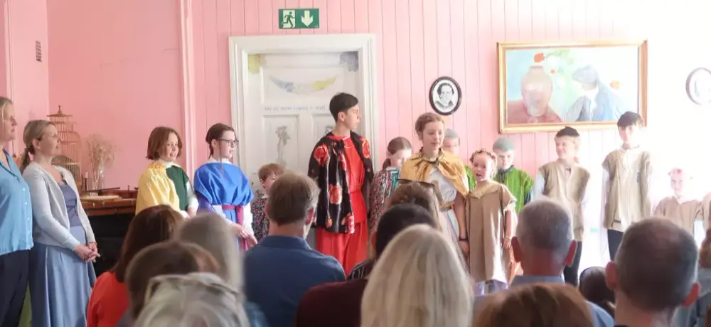 Forestillingen «Når det spirer en gang i vårt spor…» er satt sammen av dialoger, dikt, drama, eventyr og sanger av Henrik Wergeland, Herman Wildenvey, Henrik Ibsen, Ingeborg Refling Hagen. Skuespillerne som stilte var i alderen 3-13 år. De stilte i flotte, fargerike kostymer, og med seg hadde de Johanna Tøndel Birkeland på fiolin. Regien var ved Liv Cecilie Birkeland, Anne Jorunn Kydland og Maj-Christel Skramstad.