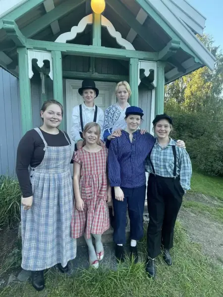 Skuespillere forbereder familieteateret "Emil i Lønneberget" på Arbeidersmåbruket Furuseth. Foto: Nes revy- og amatørteater.