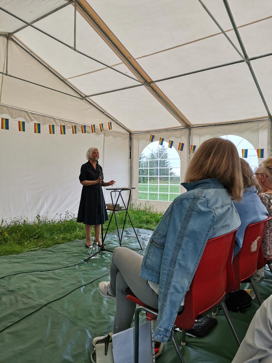 Dermed kunne vi markere Wergelands fødselsdag i le for vind og duskregn. Det ble et flott arrangement med foredrag av Sigrid Salen; To heltedikt - om Henrik Wergelands forhold til lov, samfunn og nasjonalkjensle. Et utvalg fra Nes bygdekor åpnet arrangementet med korsang. "Til min Gyldenlak" ble framført av Jostein Øien. Fiolinist Kaja Østervold stod for vakre musikalske innslag.