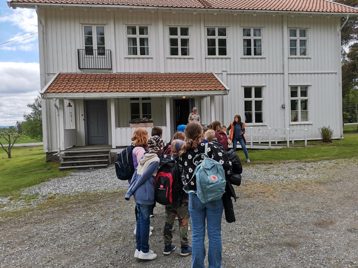 Skoleelever stiller seg opp foran døra som i "gamledager". Jorun forteller og viser de rundt inne i skolen.