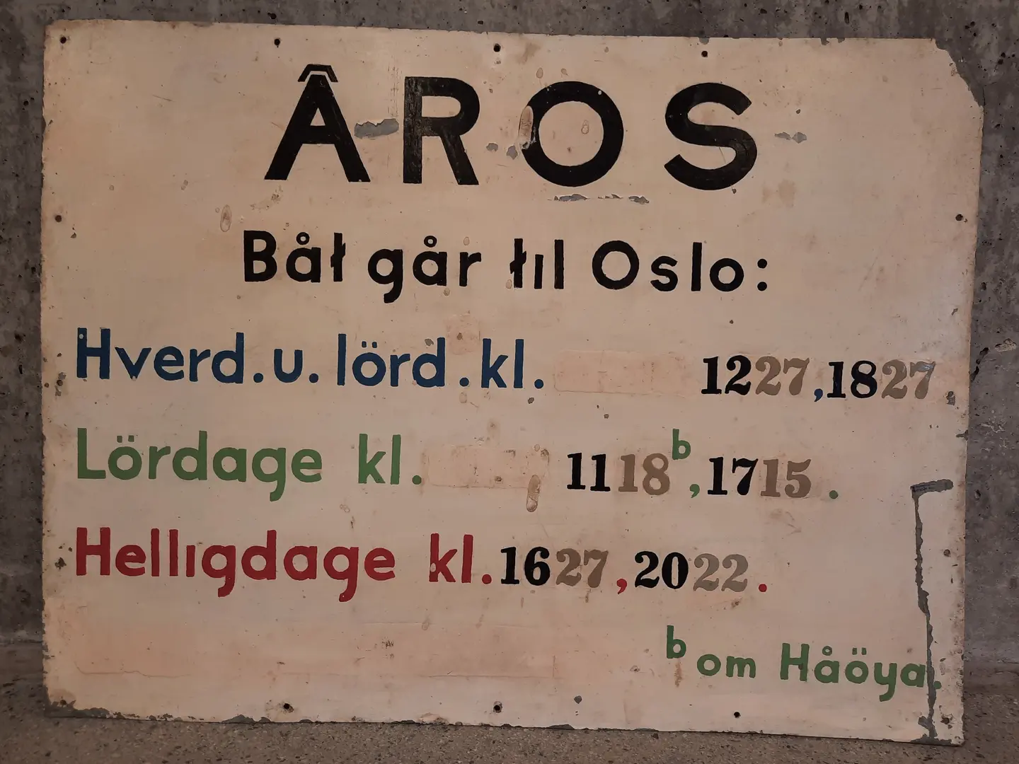 Skilt med båtrute til Åros. Skiltene er hvitmalte aluminiumsplater med svarte, blå, røde og grønne bokstaver. Skiltene er ikke mer enn 43 cm brede og 33 cm høye. Foto: MiA