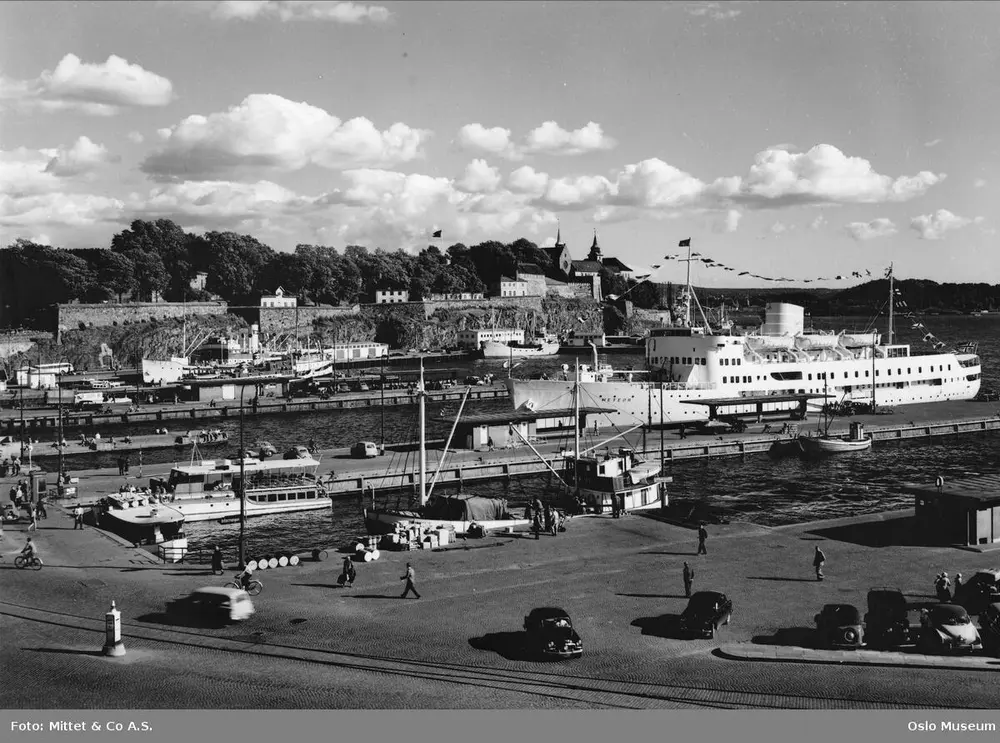 Rutebåten Trollhaug ligger ved rådhusbryggene. Ca. 1955. Foto: Mittet & Co A.S. Oslo museum