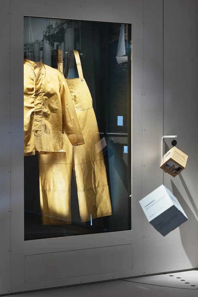 This cumbersome yellow suit is an oilskin – a garment made waterproof by painting it with linseed oil – produced in the 1950s by Helly Hansen. The company was founded in Moss in 1877.
