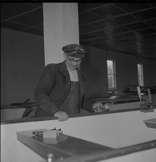 Sam O. Berge konstruerte familiebåten herwa 15 fot. Her er han i lokalene til Herwa Plast AS i Grimstad. Foto: Aust-Agder-museet