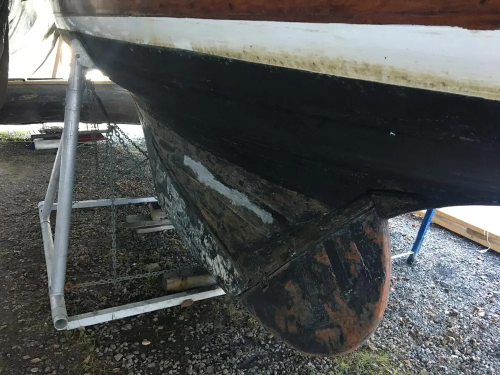 "Sally III" måtte ta sjøveien til plassen utenfor Kystkultursenteret. Før hun la ut, var det nødvendig å tette noen større sprekker i kjølen, å luse som det kalles på fagspråket. Den hvite stripa er lusingen. Foto: Cathrine Arnesen, MiA