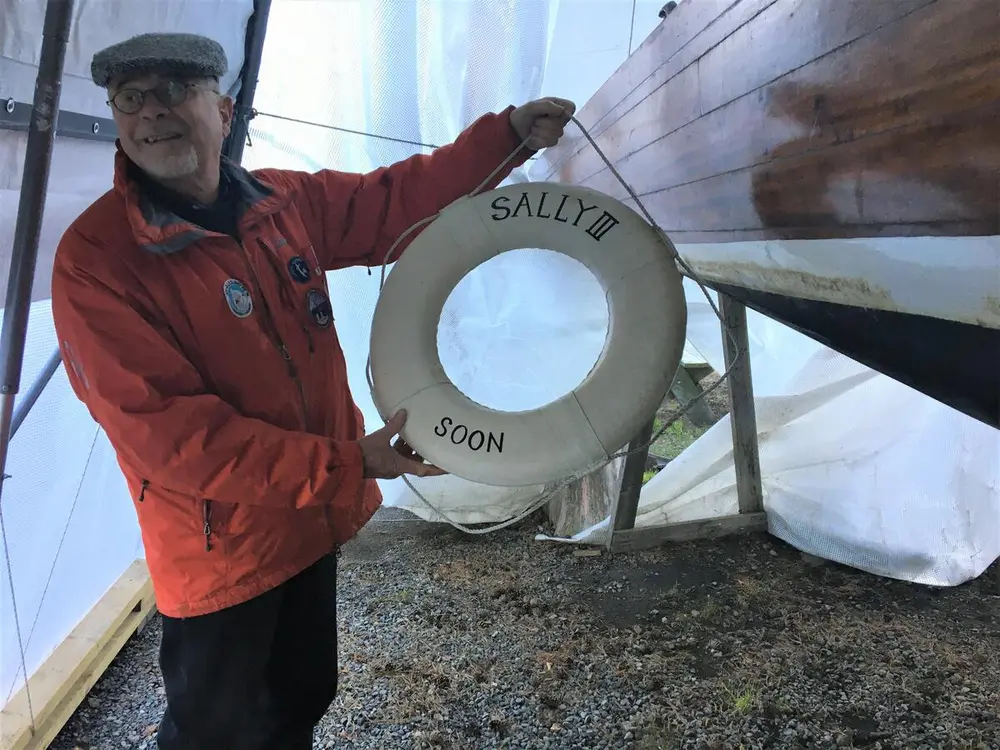 Anstein Spone har vært en primus motor for "Sally III" siden midten av 1990-tallet. Her holder han frem "Sallys" redningsbøye. Foto: Cathrine Arnesen, MiA.