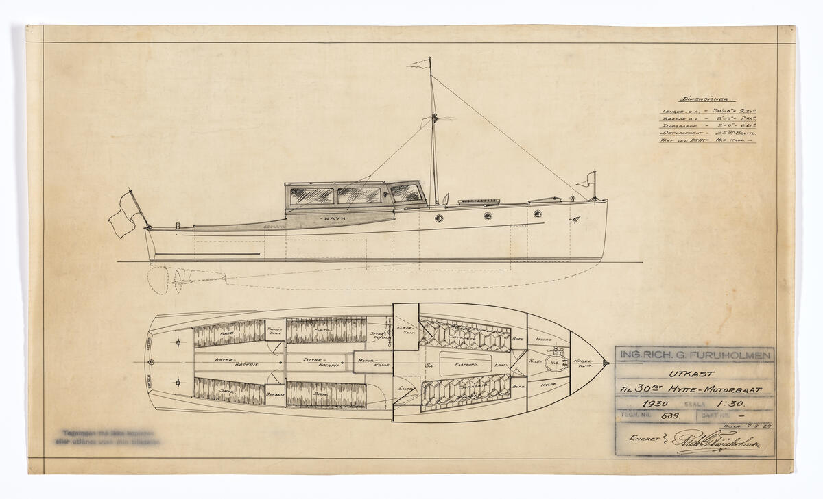 Tegning av fritidsbåt fra arkivet til skipskonstruktør Otto L. Scheen. Foto: Ulf Palm/MiA – Museene i Akershus