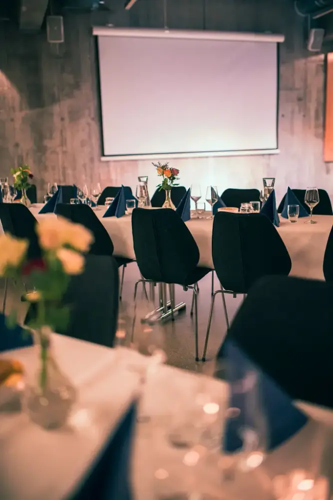 - Stort møterom 177 kvm. Plass til 70 pers. i konferanse eller 120 pers. i kinooppsett.