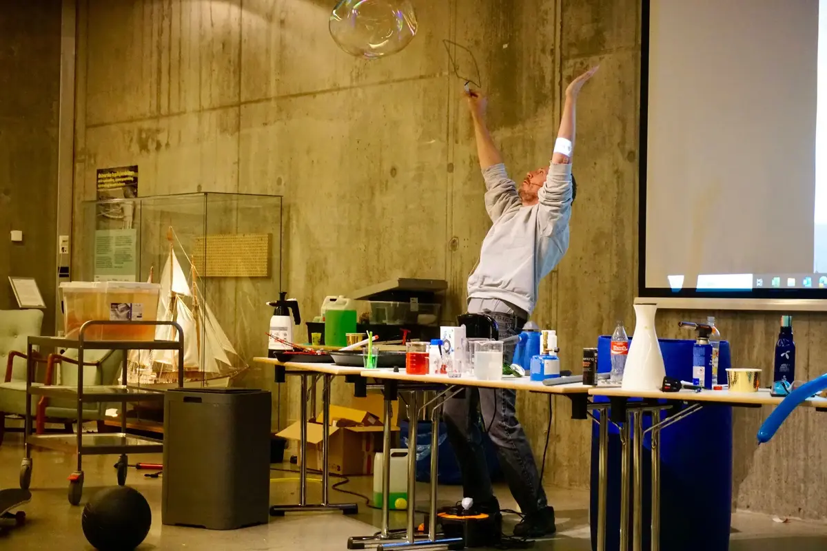 I vitenshowet «Alt som er flytende» utforsker vi væsker, krefter og fenomener som former verden rundt oss. Gjennom trygge, visuelle eksperimenter får publikum blant annet se hvordan havstrømmer fungerer, hvorfor enorme skip kan flyte, og hva som skjer når flytende nitrogen brukes i eksperimenter. Det blir også små, kontrollerte eksplosjoner som viser naturkreftene i aksjon – til stor fascinasjon for både store og små.