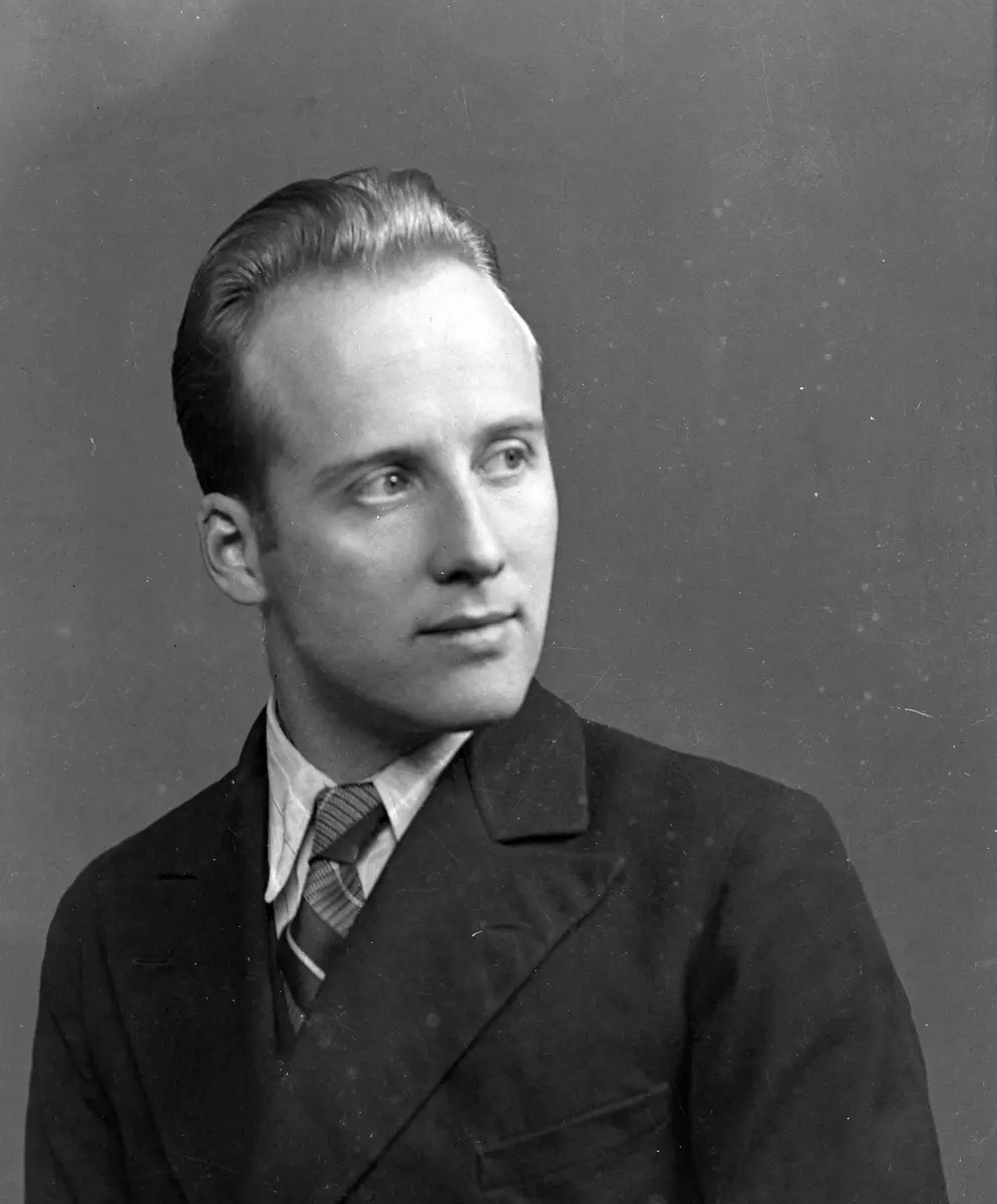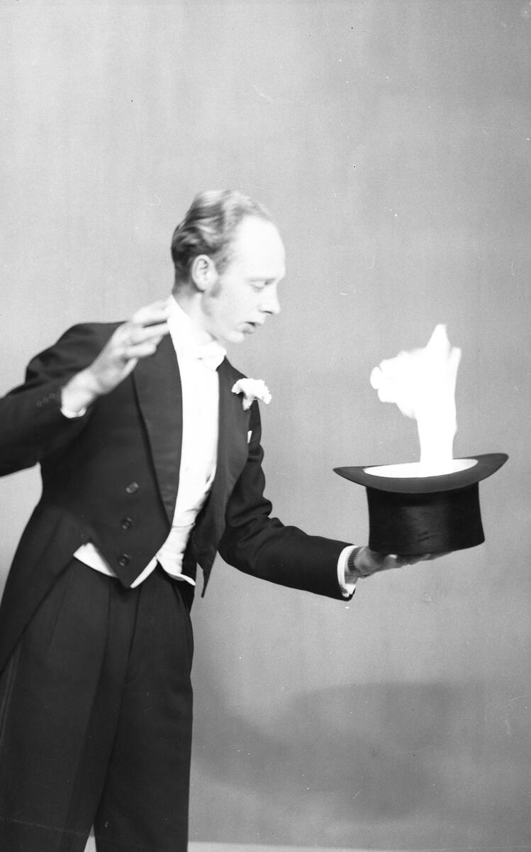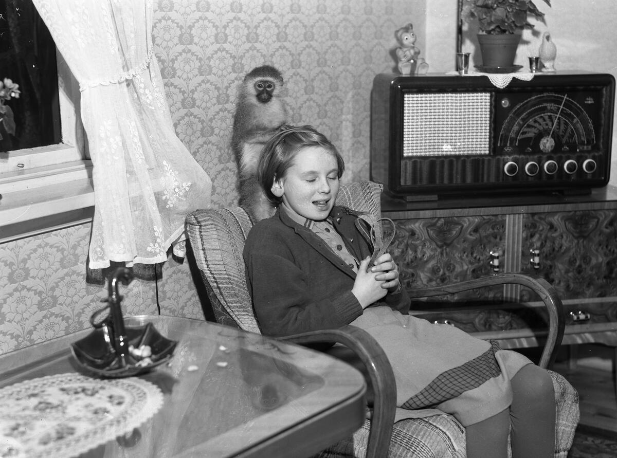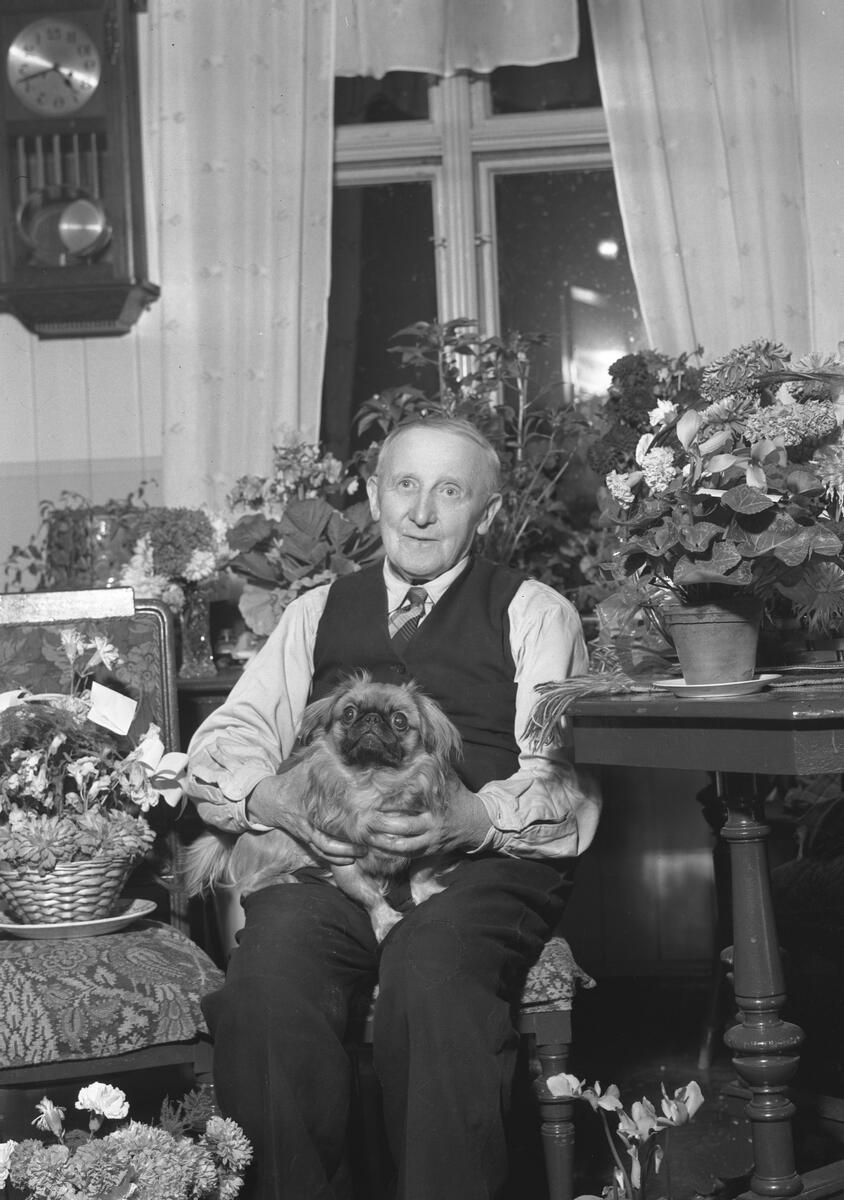 Veggene bak han er pent tapetsert, og på en kommode står en radio. Vi kan ikke se på fotografiet om det strømmer lyd ut av den.