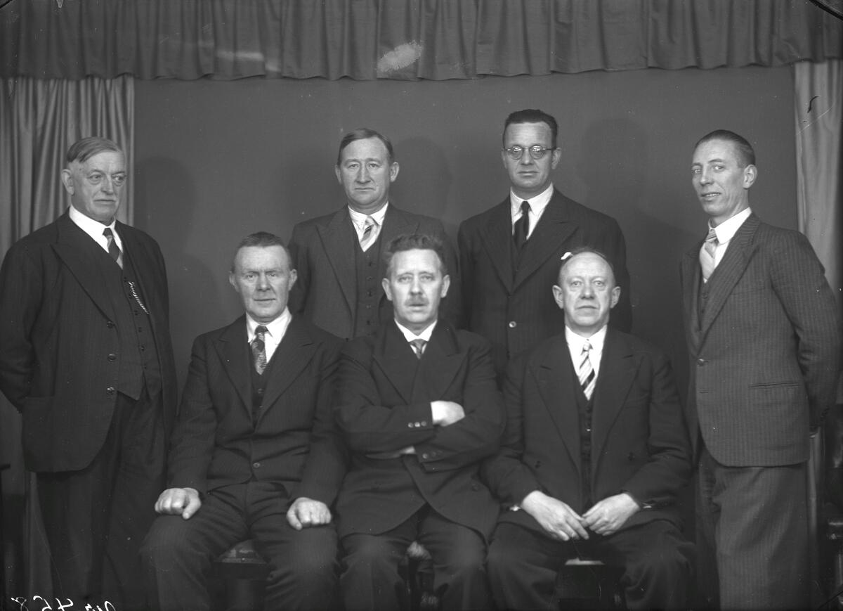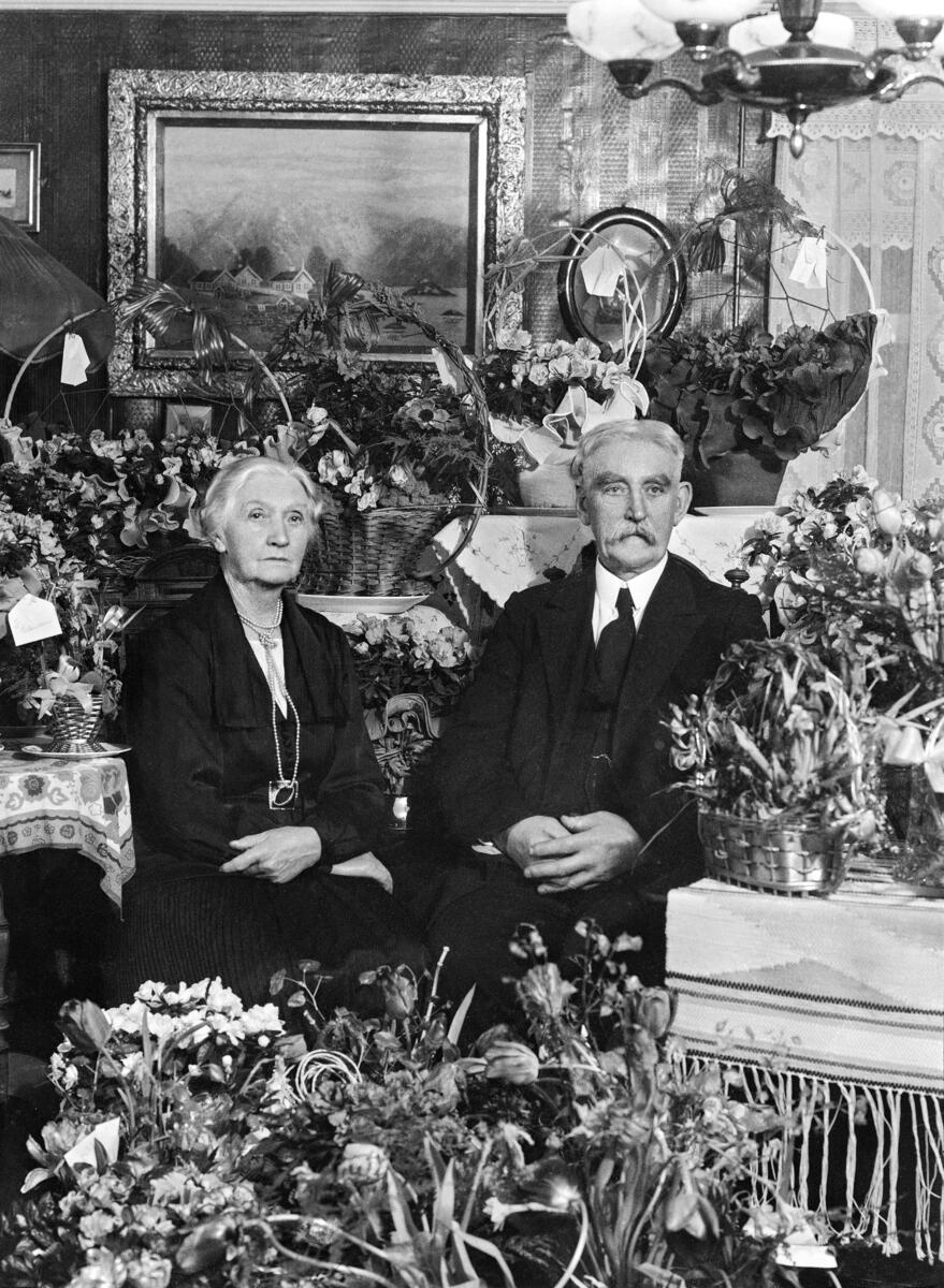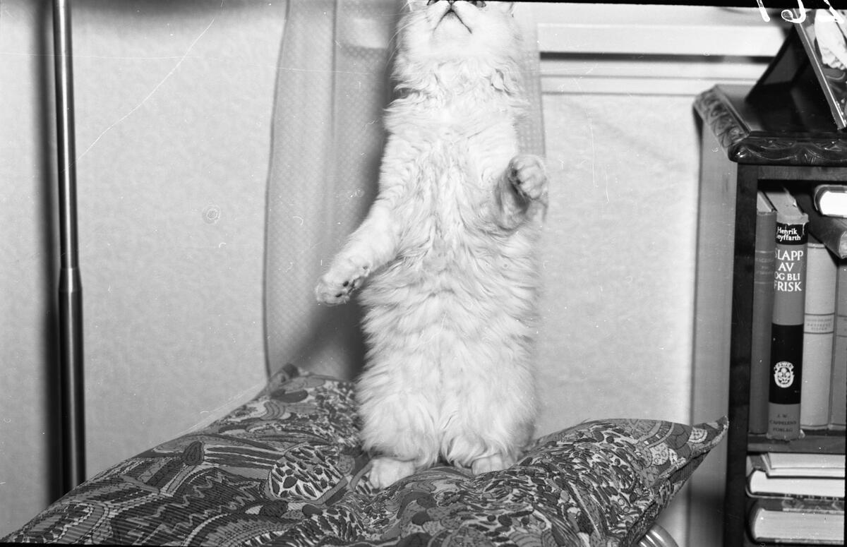 Veggene bak han er pent tapetsert, og på en kommode står en radio. Vi kan ikke se på fotografiet om det strømmer lyd ut av den.