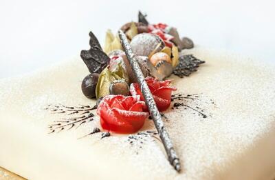 En kjempestor marsipankake fra Baker Nordby skal spises opp. Kaken deles ut av kommunens og museets ledelse.