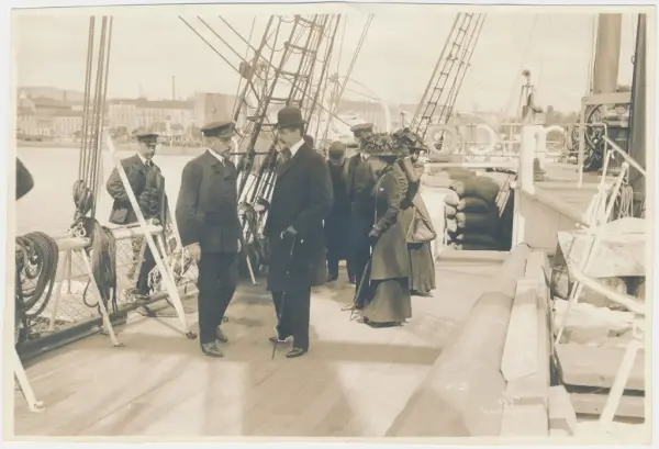 The royal couple arrive on board the Fram, having come straight from England where they attended the funeral of the queen’s father, King Edward VII. According to some, the queen looks worn out, and the king is also understood to be clearly moved and fraught.