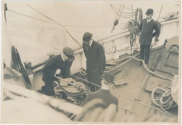 On deck they are received by Amundsen. Fridtjof Nansen is also on board and standing behind are the crew in blue suits. One by one they are presented to the royal couple.