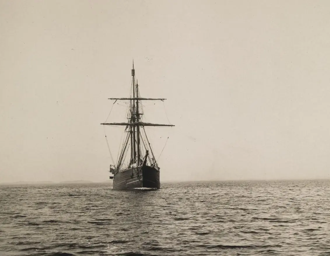 At home at Uranienborg a farewell party is thrown. Moored just offshore is Fram and on board are the equipment and materials for Framheim. Ashore are Amundsen, the crew, and relatives and friends. In the garden are tables covered with flowers and cakes, and in the glasses there is sparkling wine. The gentlemen smoke cigars. Everyone has turned up to wish their loved ones a good trip north, ready to say goodbye for perhaps seven years.