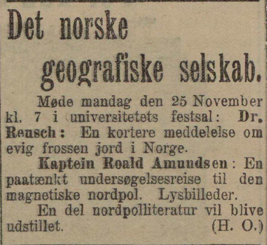 I avisene reklameres det med to foredrag i Universitetets festsal denne kvelden. Foran talerstolen er det utstilt en del polarlitteratur. Etter at selskabets leder, Hans Henrik Reusch, har holdt sitt innlegg om permafrost er det Amundsens tur.