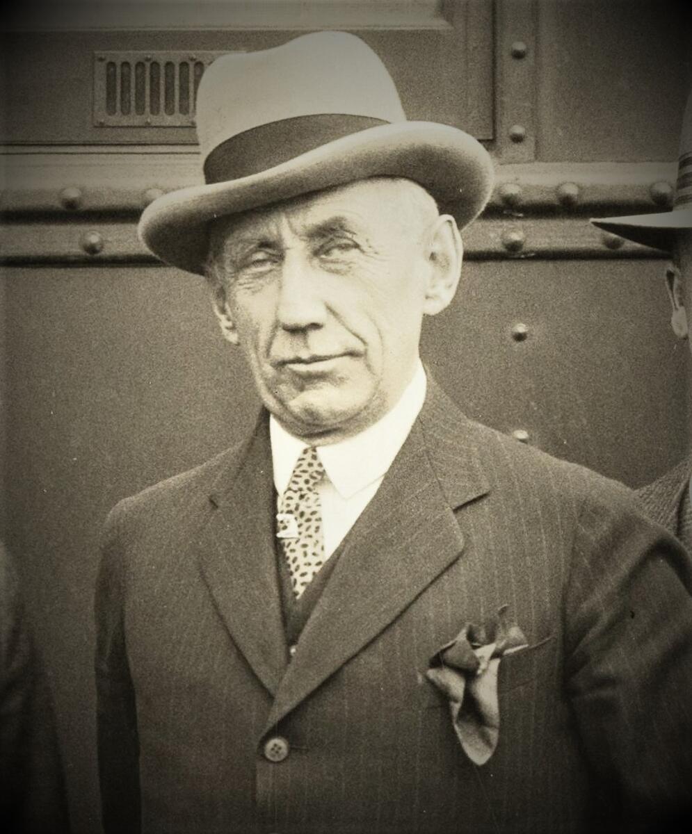 Fotografert foran en togvogn i Wenatchee, Washington, på foredragsturne i Amerika våren 1927, stod Amundsen sammen med flere dresskledd menn.